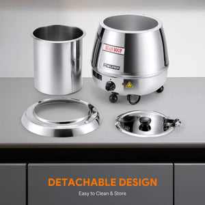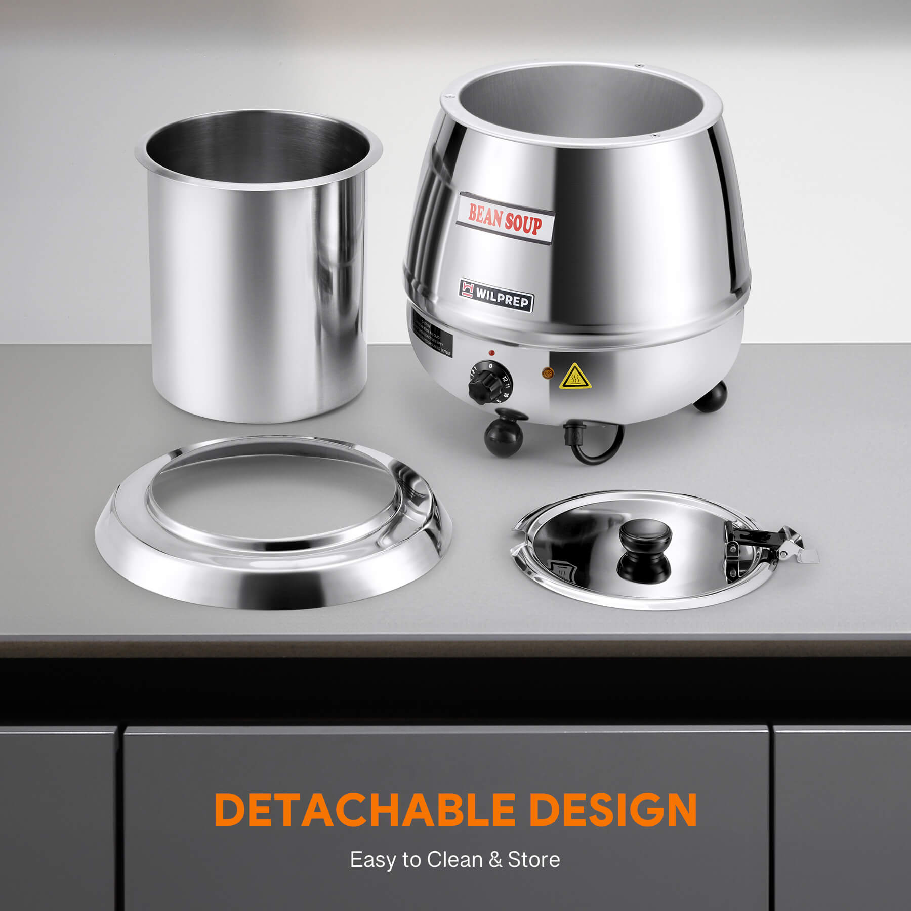 Much Easier Cleanup: This commercial soup warmer streamlines maintenance with a detachable hinged lid, collar, and inner pot, all dishwasher safe for quick and easy cleaning. The pot's stainless steel interior also makes manual cleanup a breeze!