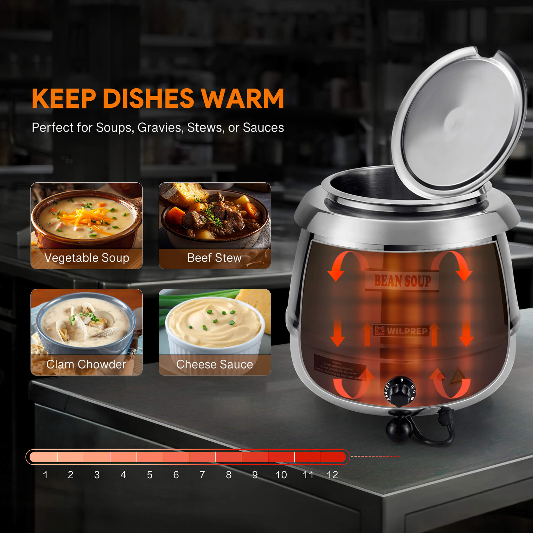 Feed a Crowd: With a spacious 10 quart (9.3 L) capacity and 400W heating power, Wilprep's soup kettle warmer ensures your soups and sauces are always ready for serving no matter the occasion, be it a bustling restaurant or a cozy family gathering.