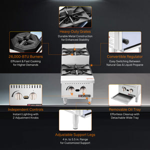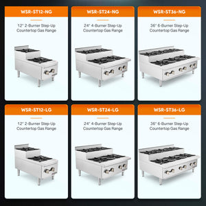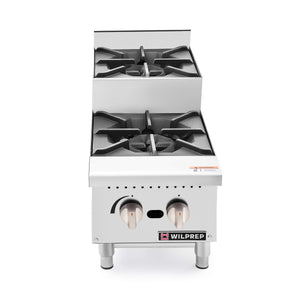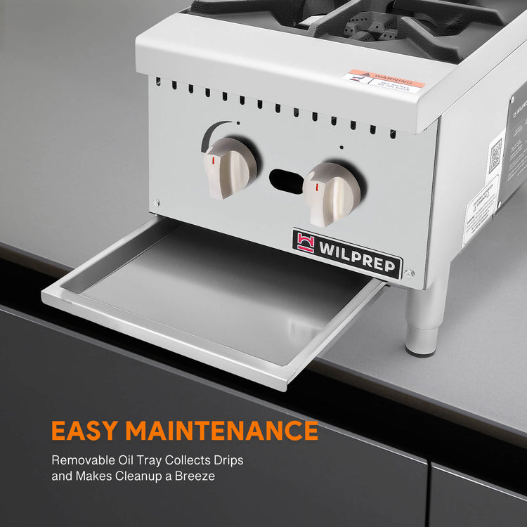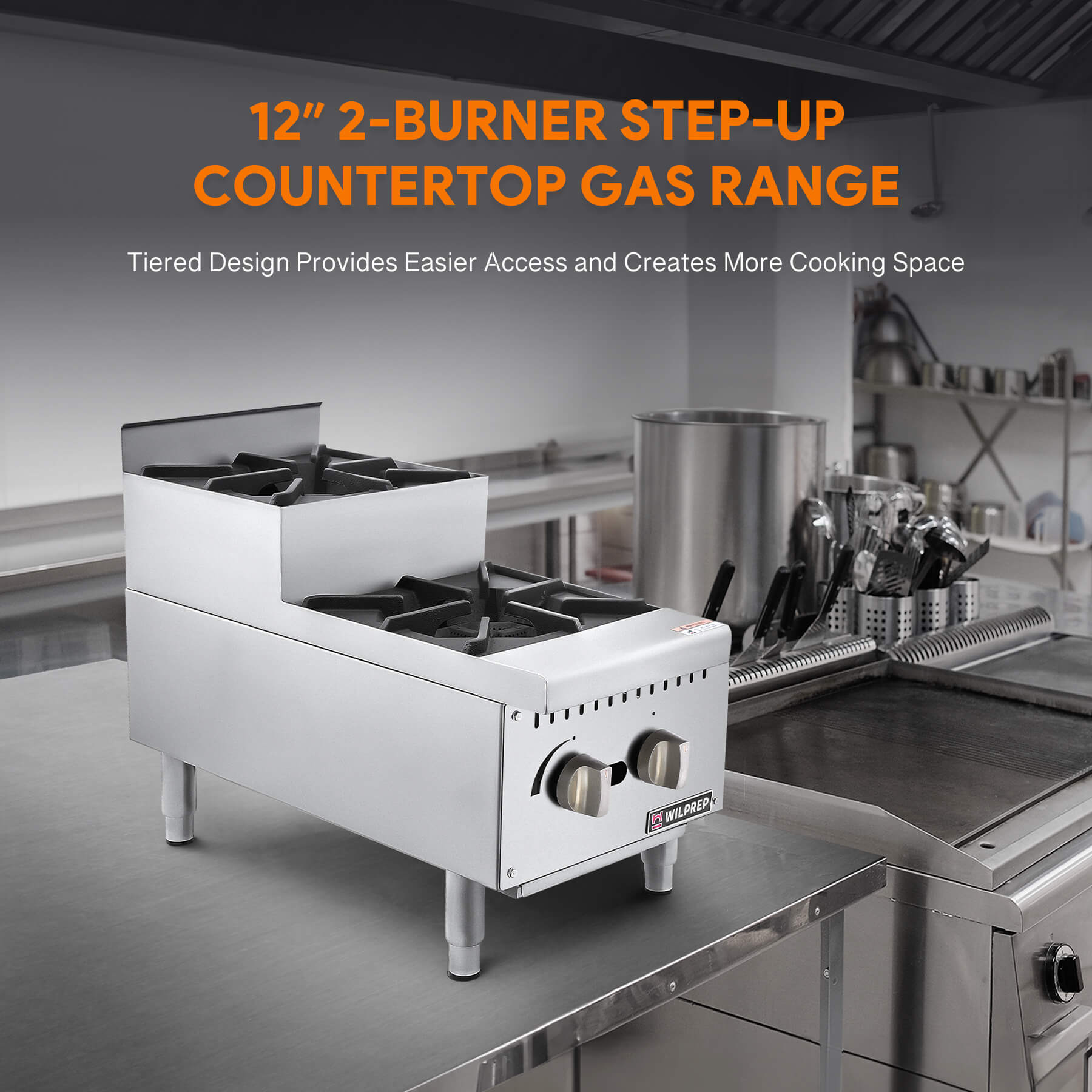 Handy Step-Up Design: This 12 in. 2-burner step-up countertop gas range by Wilprep provides convenient access to rear pots and pans while offering additional cooking space for simultaneous meal preparation. Easily switch between NG and LPG with the gas regulator for added convenience.