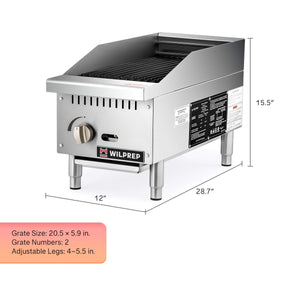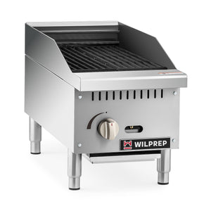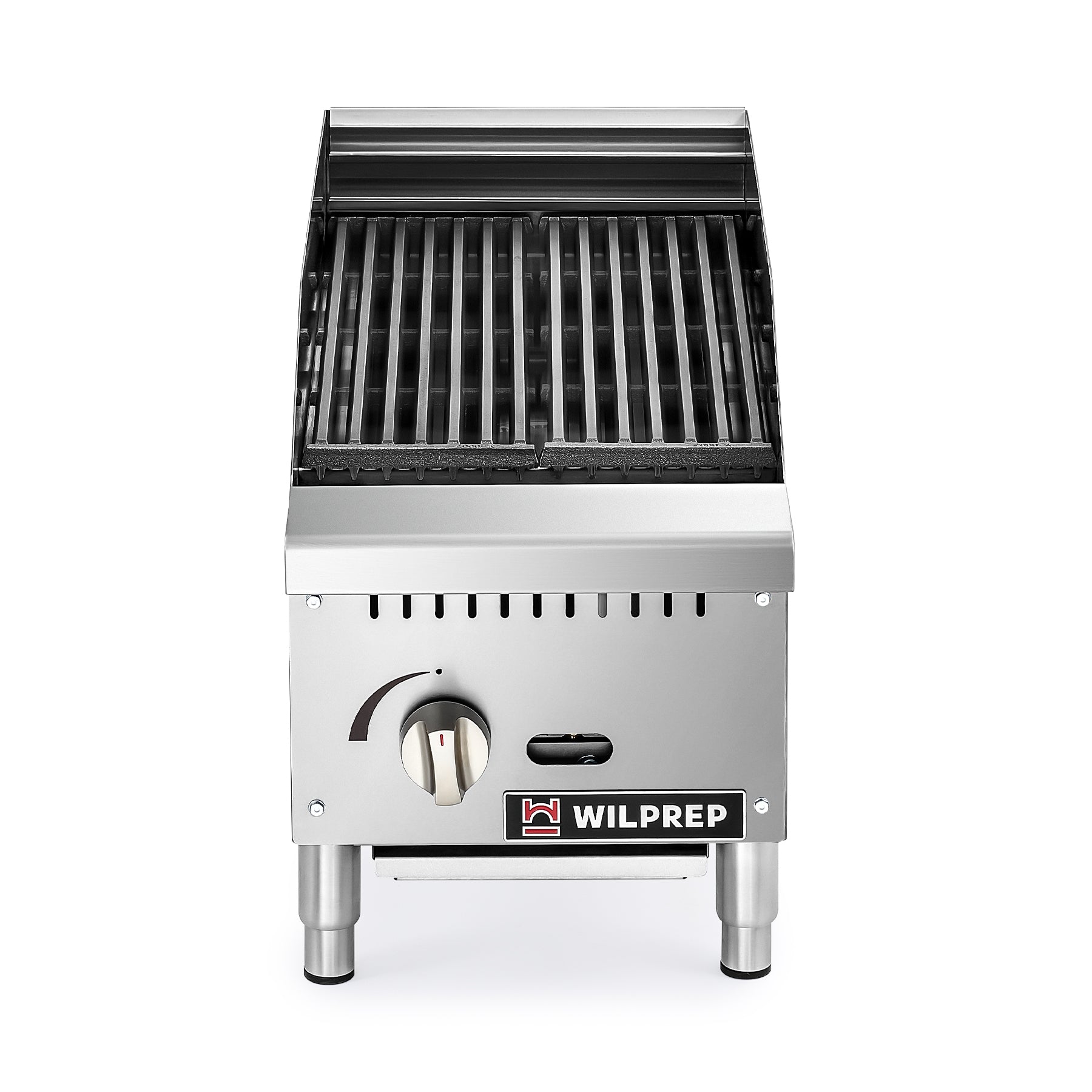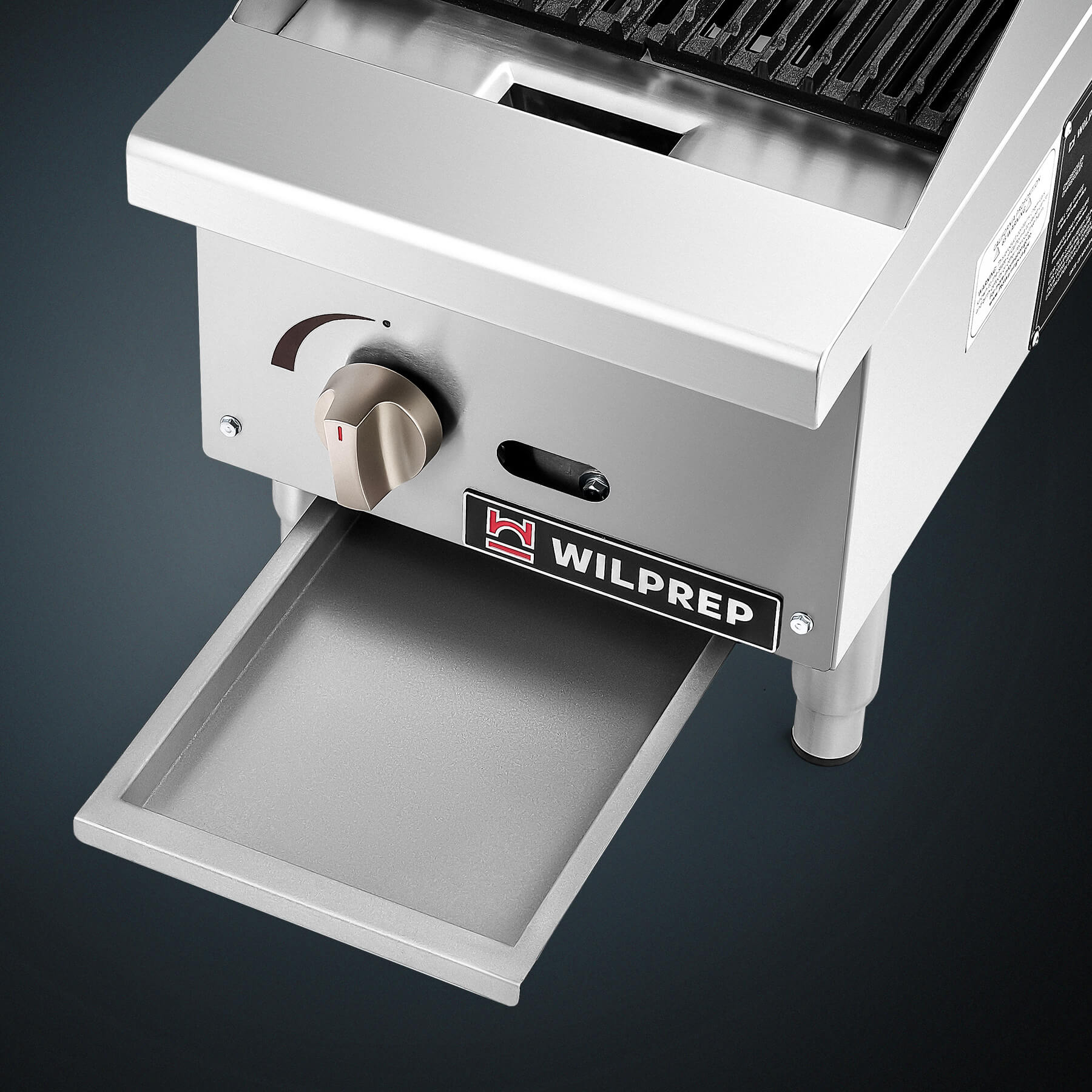 Wilprep's 12-inch countertop radiant charcoal broiler, heated by a 35,000 BTU U-shaped burner, ensures speedy and uniform broiling. Perfect for effortlessly preparing a range of delights, from juicy burgers to charred vegetables.