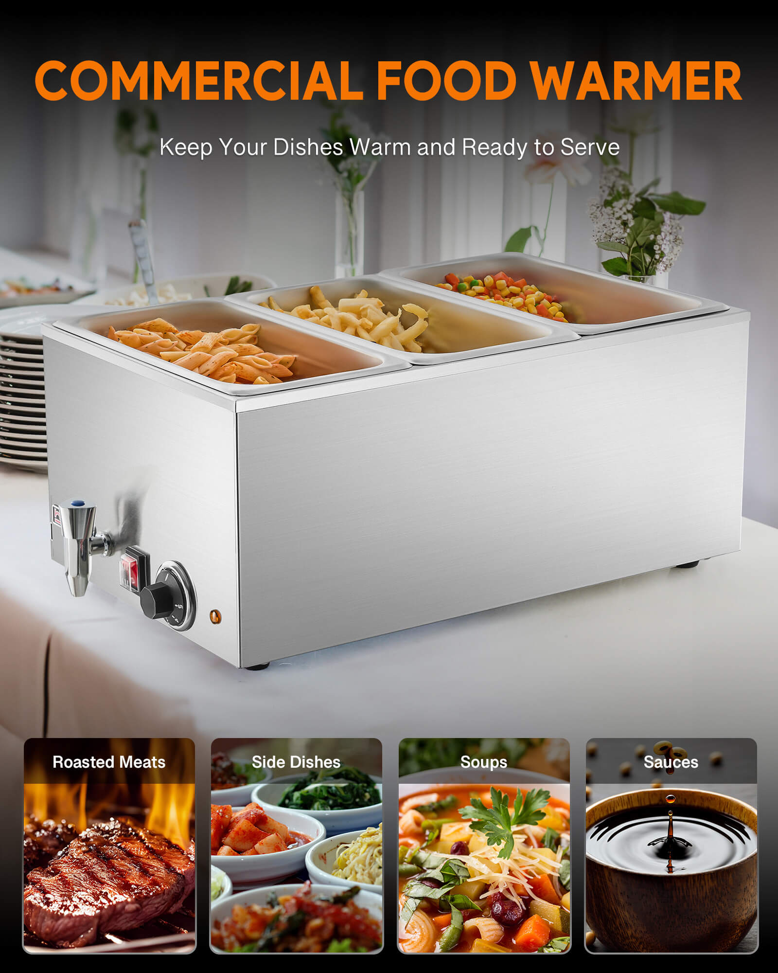 - Superior Heat Retention: Enjoy prolonged warmth for your meals with this bain marie food warmer's insulating ceramic fiber layer, keeping dishes hot and inviting with minimal electricity usage. Its drainage faucet ensures effortless liquid disposal without manual hassle.