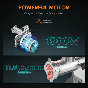 - Powerful Motor: Tailored for high-volume meat mincing, our electric meat grinder boasts a robust 1500W motor and achieves a grinding speed of 705.5 lb./h, essential for bustling restaurants and boutique butcher shops, delivering reliable and precise results with every use.