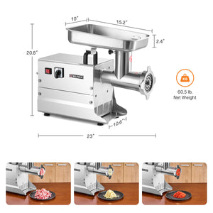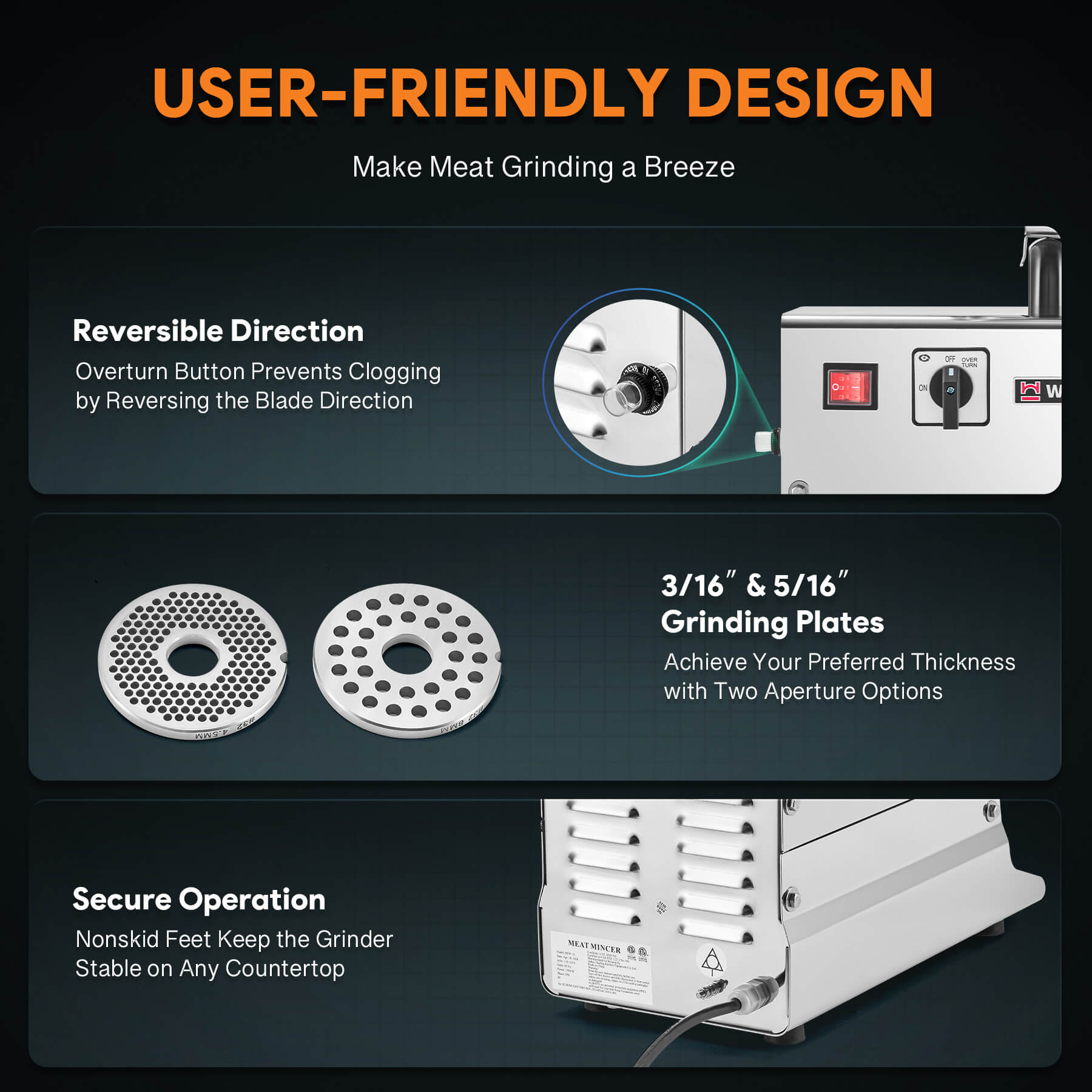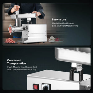 - Enhanced Safety: Engineered with advanced safety features, including built-in overload protection and a reverse function to prevent clogging, and supported by ETL & ETL Sanitation certifications, this meat mincer ensures compliance with rigorous industry standards.