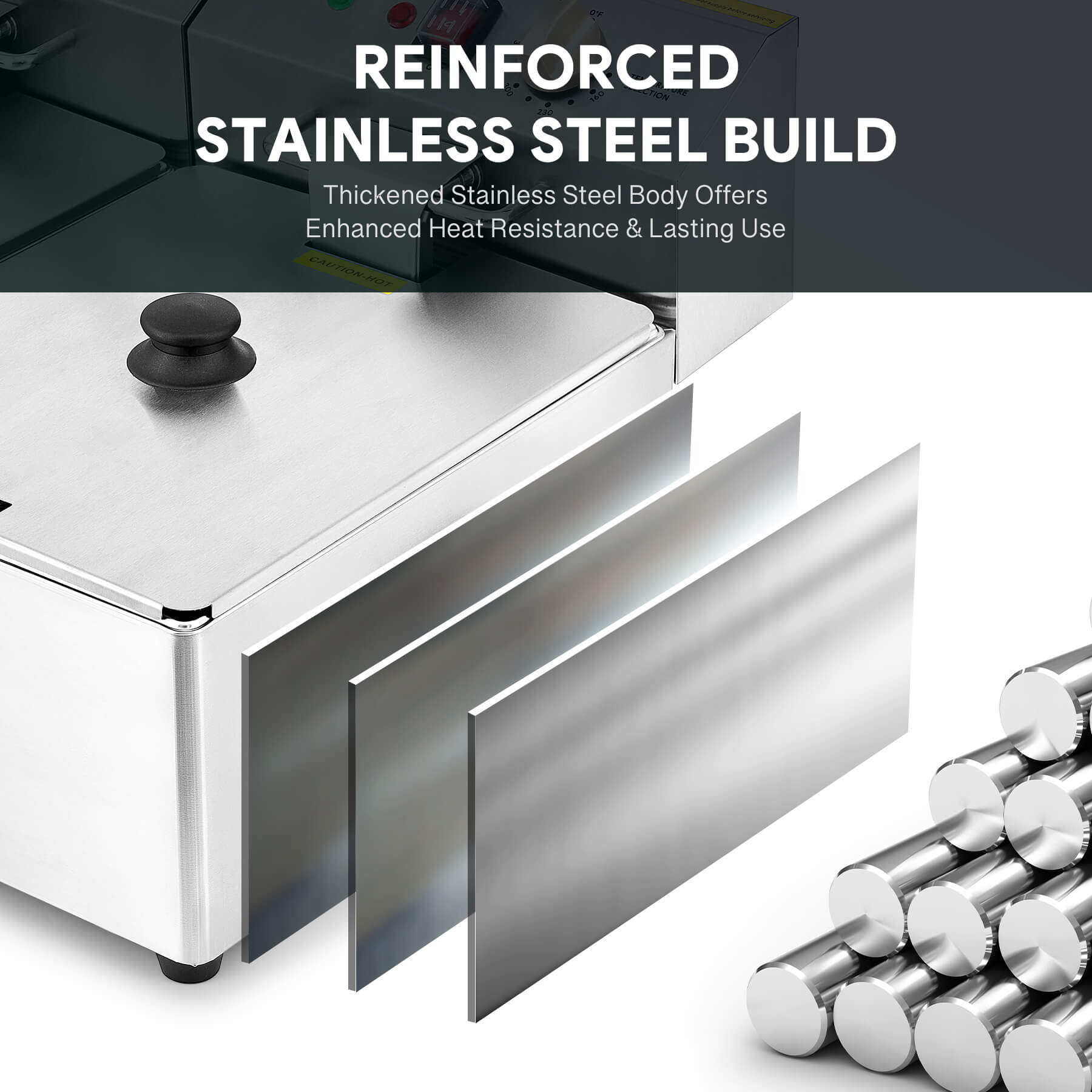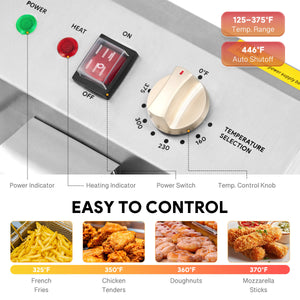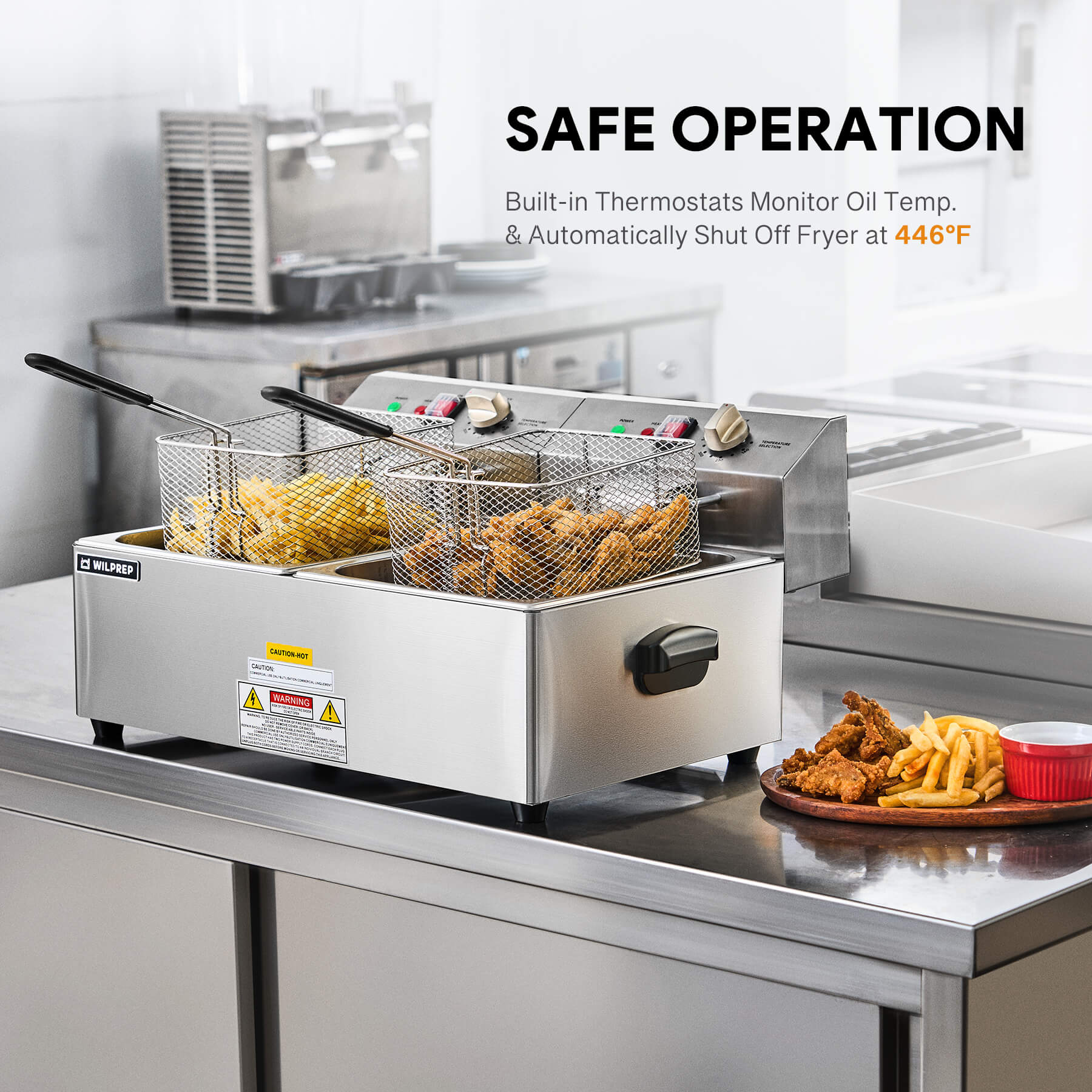 Food-Grade Safety: This ETL & ETL Sanitation-certified commercial fryer features 2 food-grade safe 304 stainless steel oil tanks, with built-in thermostats that automatically shut off at 446°F.