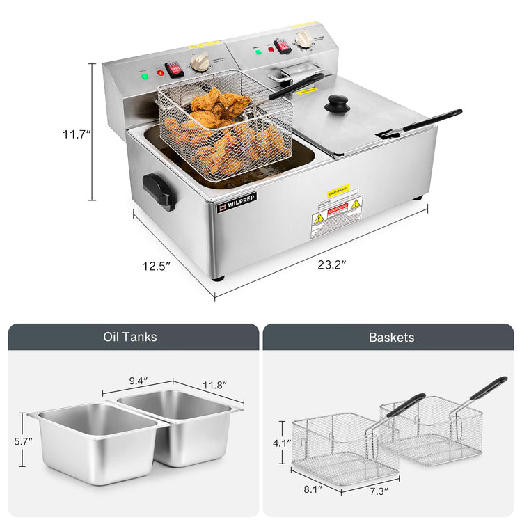 Powerful Cooking Performance: With 2 robust 1600W heating elements, Wilprep's dual tank commercial deep fryer delivers fast and consistent cooking, perfect for serving up delicious treats at buffets, food trucks, or delis.
