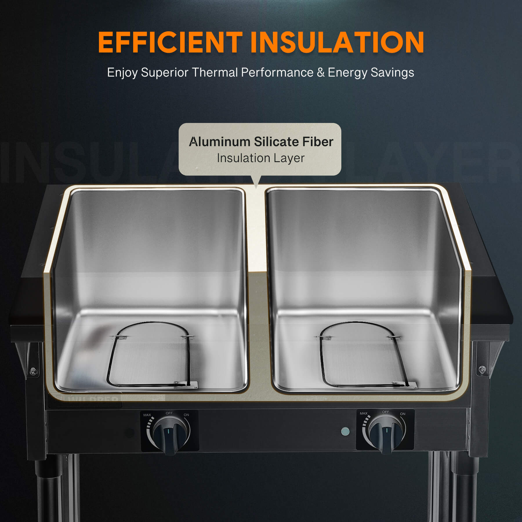 Superior Insulation: Enjoy prolonged warmth for your meals thanks to our commercial food warmer's aluminum silicate fiber insulation layer, keeping your dishes hot and inviting while operating with minimal electricity usage.