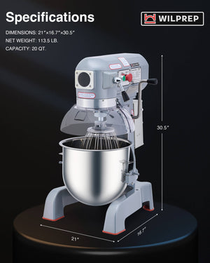 - Enhanced Culinary Performance: This commercial mixer from Wilprep features a large bowl to thoroughly mix up to 20 qt. of ingredients, from fluffy dough to dense cream, ensuring a steady supply of delicious treats for restaurants, bakeries, pizzerias, and big get-togethers.