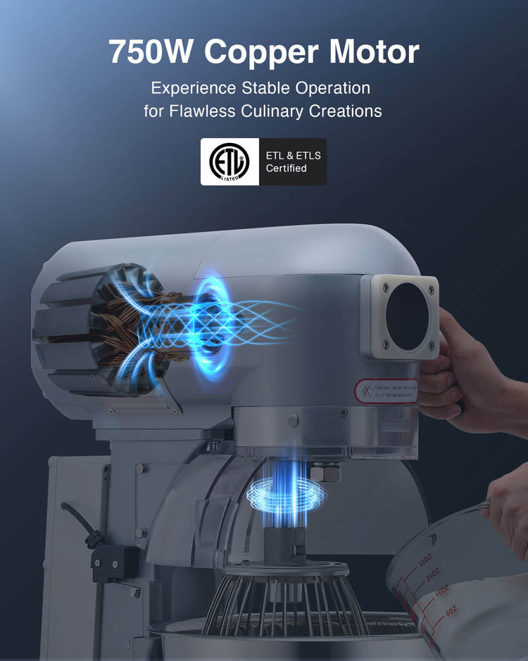 - Built to Last: Certified by ETL and ETLs, this industrial mixer is durably built for dependable performance. The bowl and three attachments are all made from stainless steel so they stay strong, safe, and easy to clean through years of heavy use.