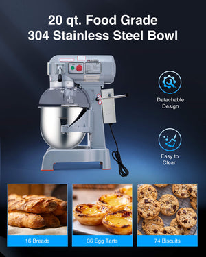 20 qt Commercial Mixer, 750W 3 Speed with Dough Hook Beater Whisk