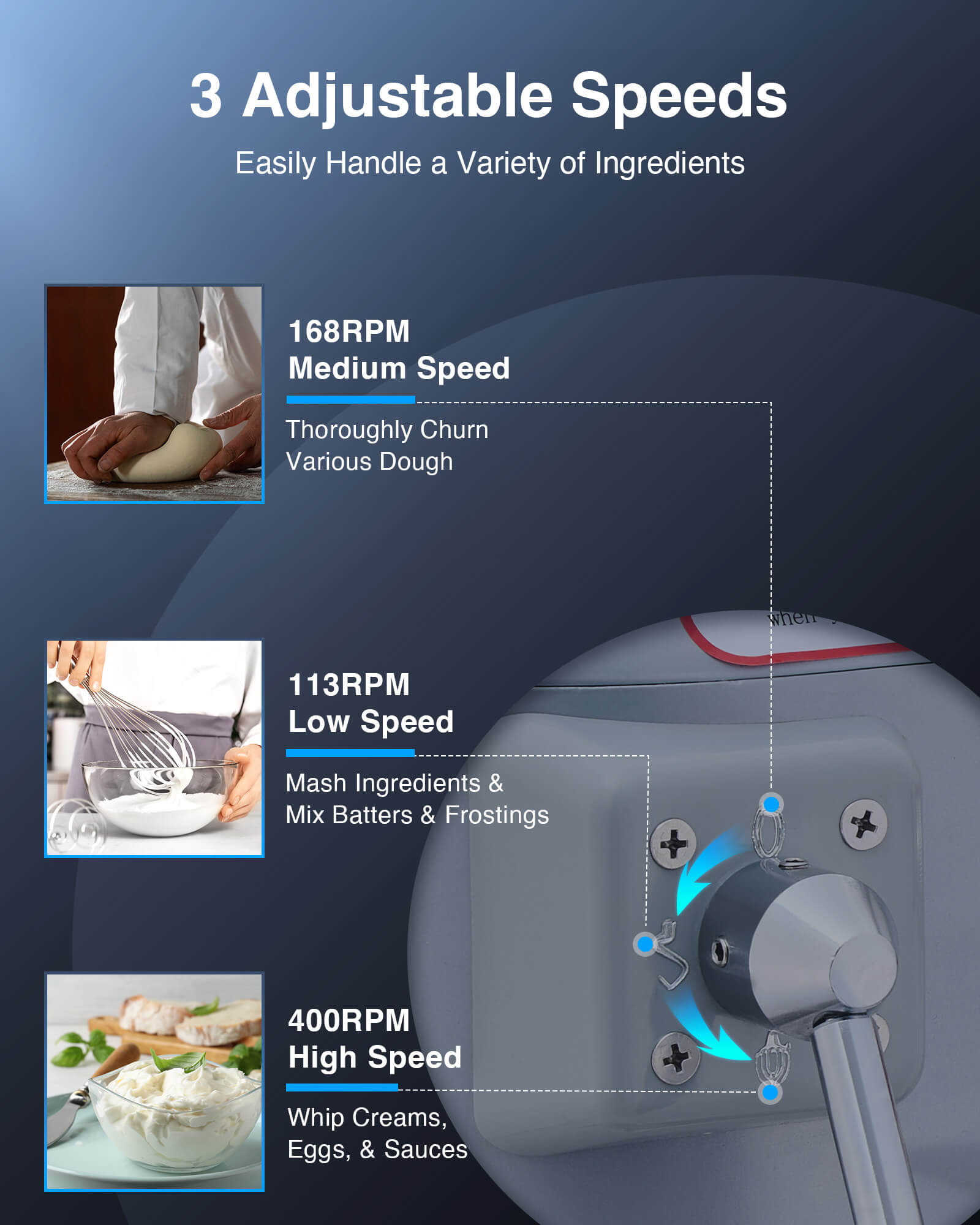 - Customize Mixing Speeds: Experience consistent and even mixing with our 750W copper motor. Simply switch between three speeds: use the dough hook at 113 rpm, the flat beater at 168 rpm, and the wire whip at 400 rpm for optimal results.