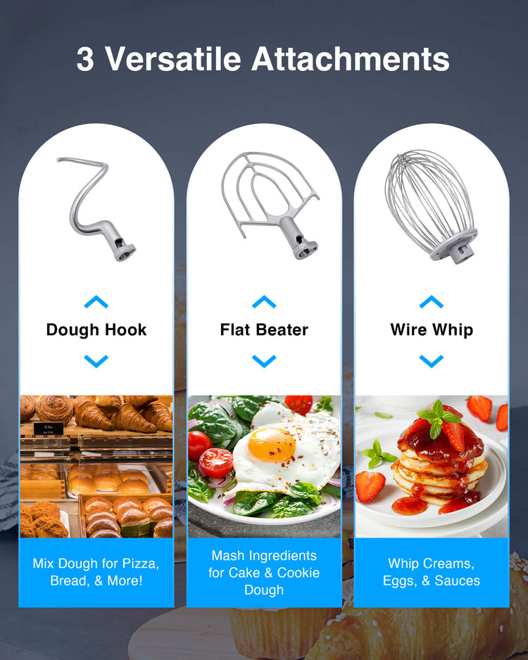 - Multipurpose Attachments: Enjoy your flawless culinary creations every time. Our planetary mixer comes with a dough hook for effortless heavy-duty mixing, a flat beater for easy ingredient mashing, and a wire whisk for perfect whipped creams or eggs.