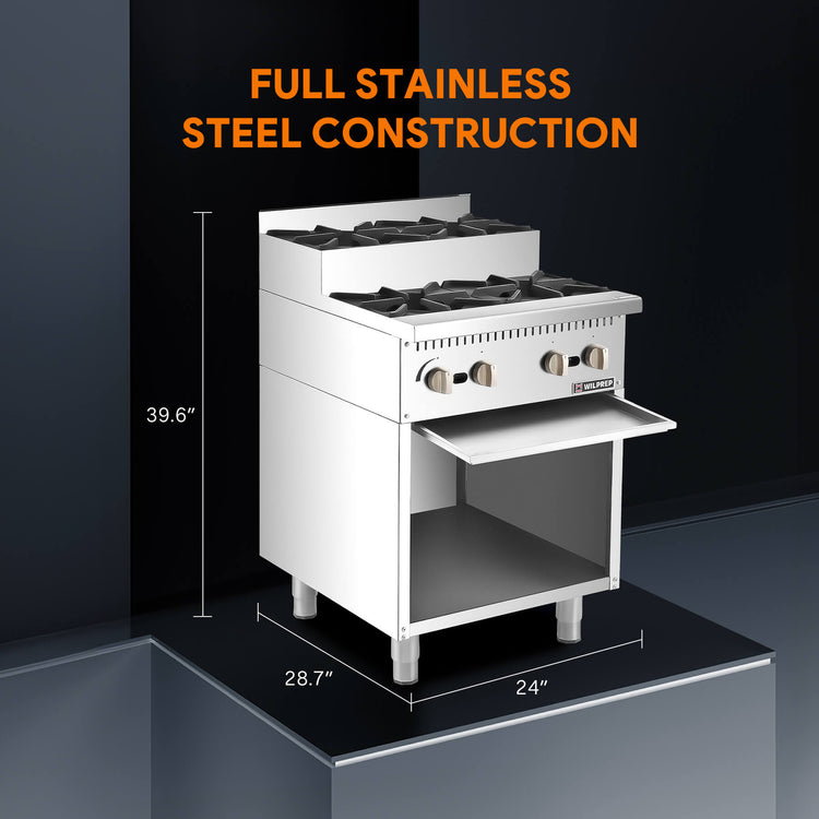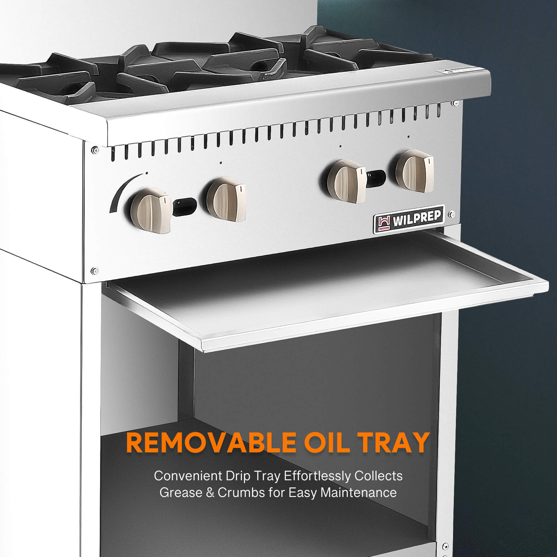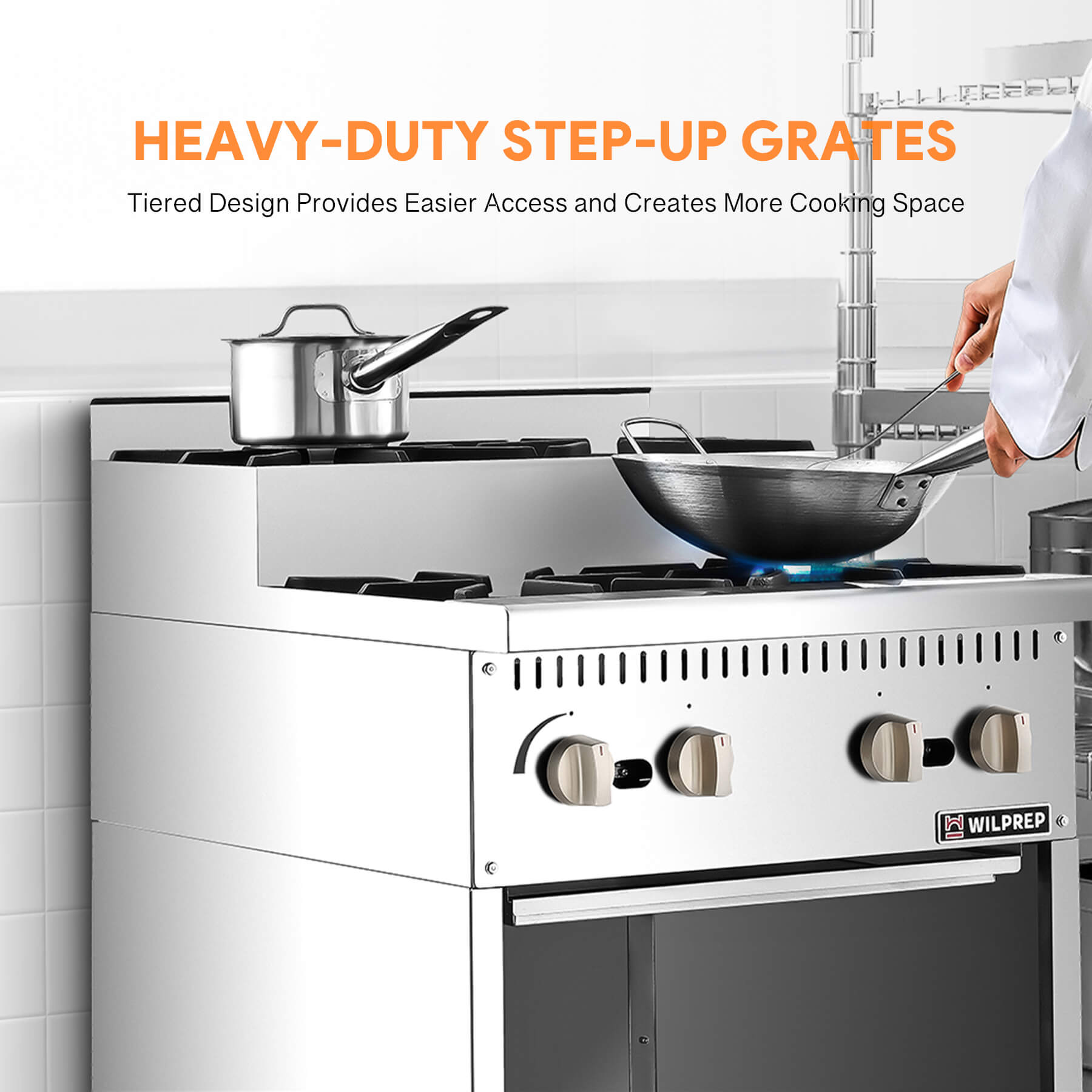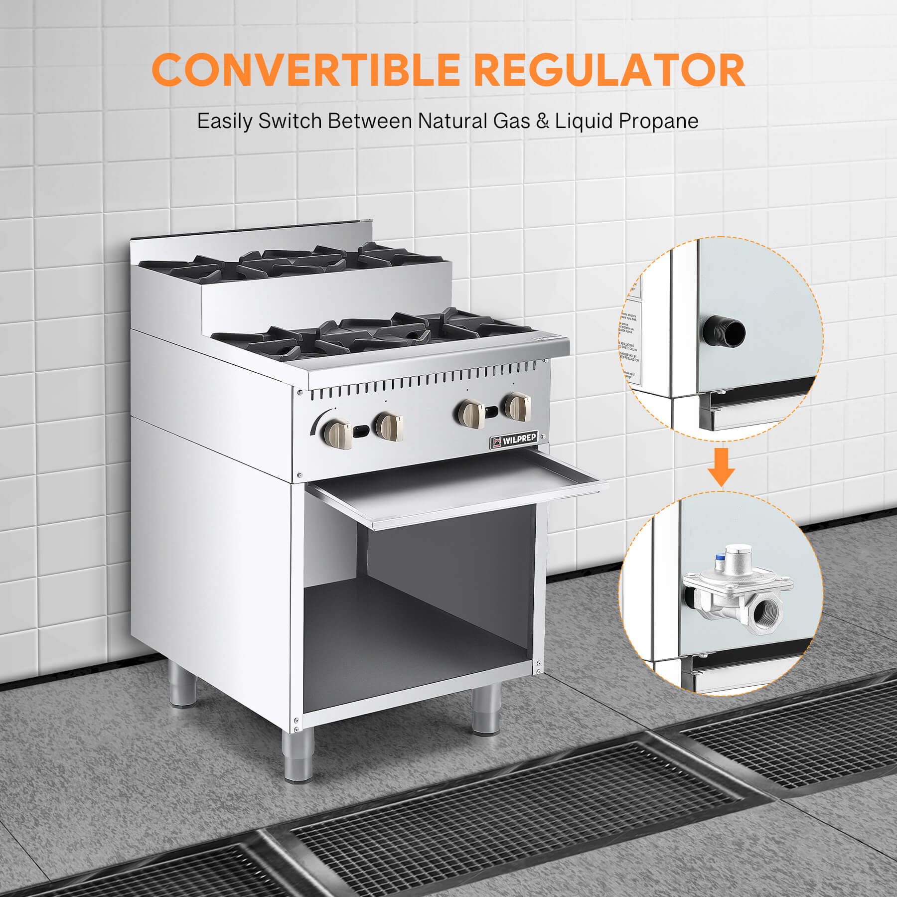 Elevated Stove Top Design: This 24 in. 4-burner step-up gas range by Wilprep provides convenient access to rear pots and pans while offering additional cooking space for simultaneous meal preparation. Easily switch between NG and LPG with the gas regulator for added convenience.