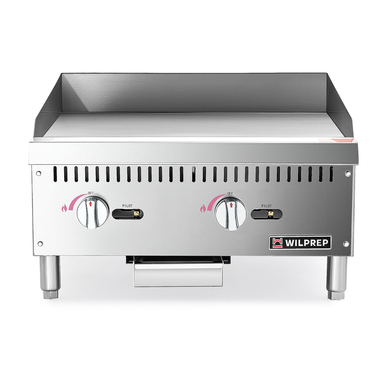 Enjoy Easy Delicacy Prep: Wilprep's 24 in. commercial gas griddle, heated by two 30,000 BTU U-shaped burners, ensures speedy and uniform heating. It's your go-to choice for effortlessly preparing a variety of delights, from fluffy pancakes to savory steaks;