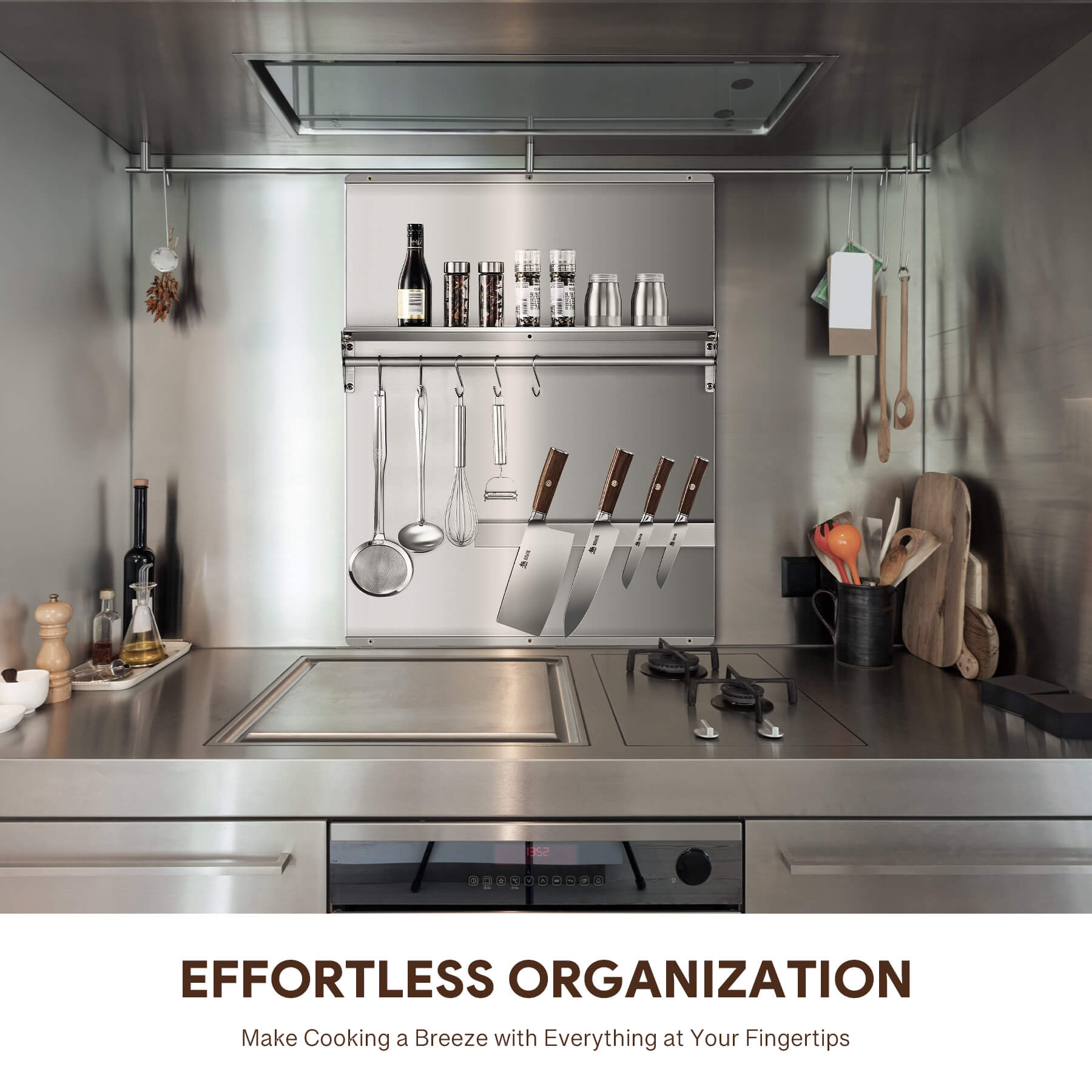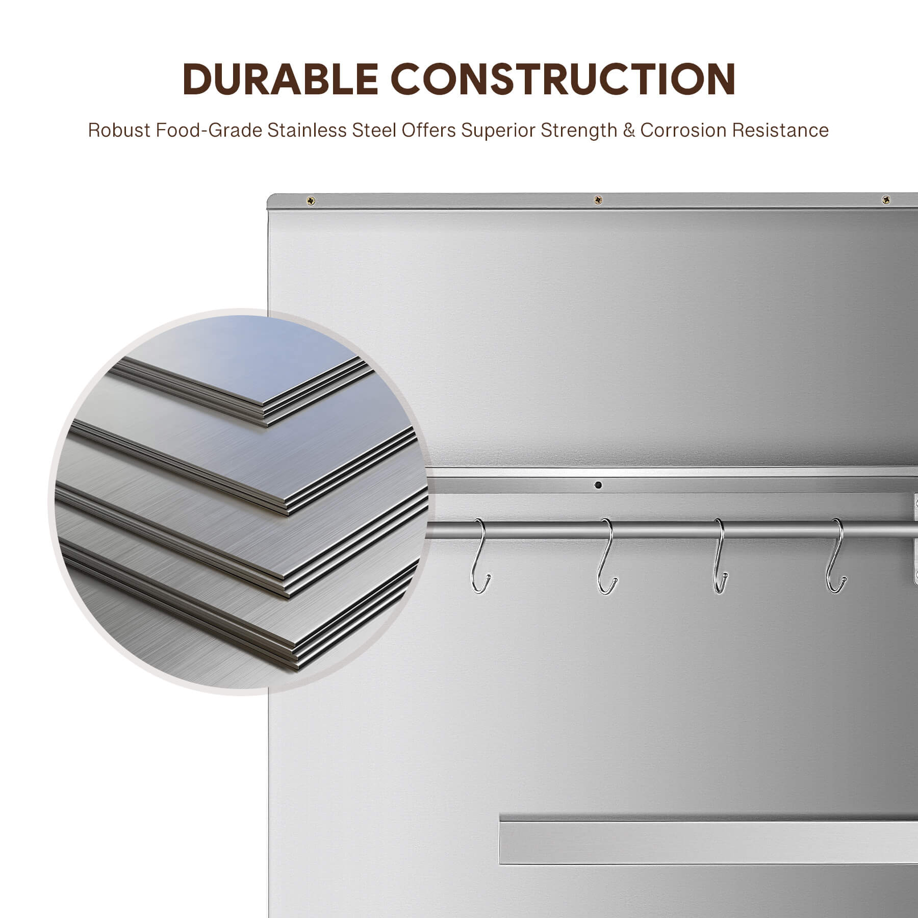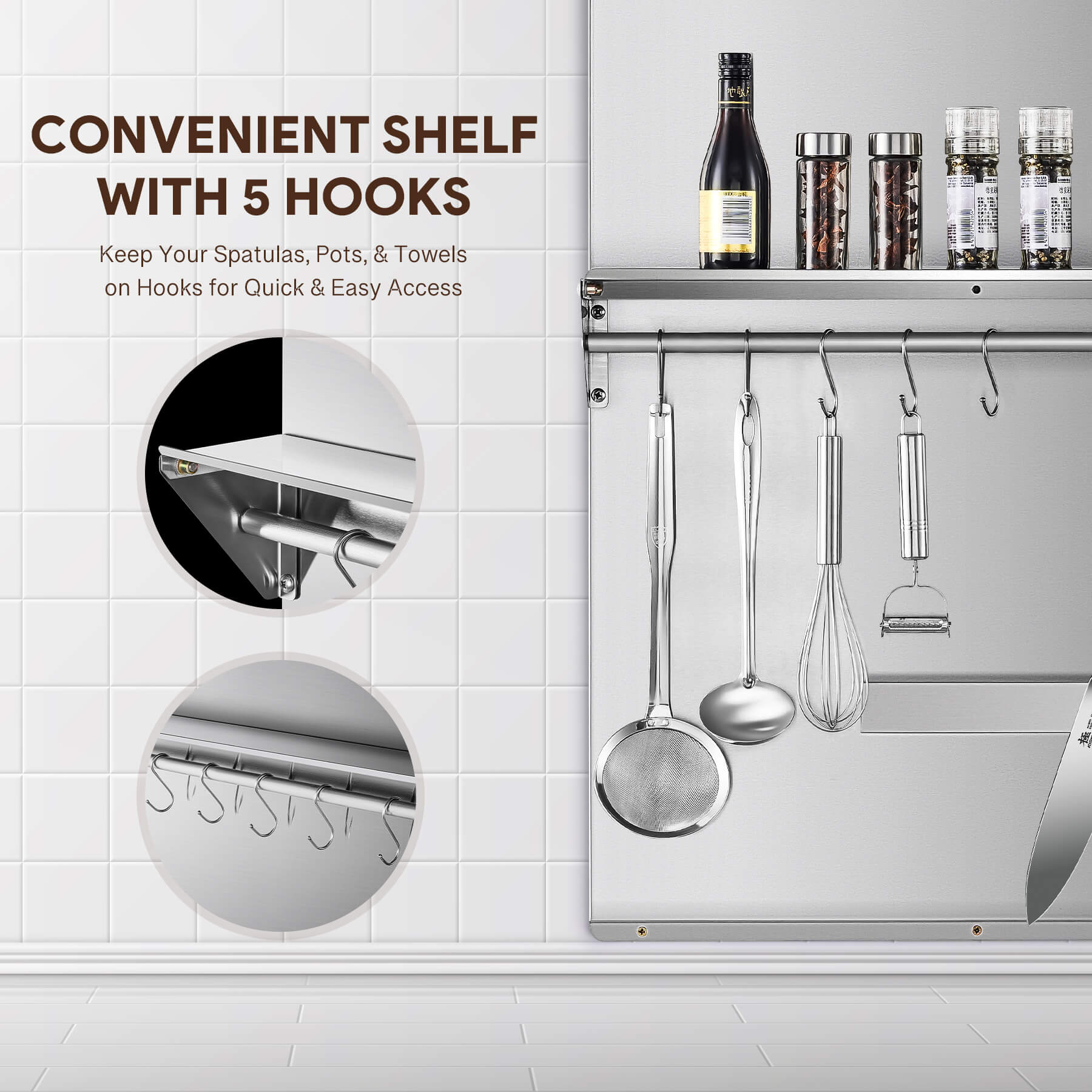 - Your Must-Haves Within Reach: Featuring a convenient storage shelf and five hooks, this stainless steel backsplash ensures that your favorite spices and essential tools are always at your fingertips.