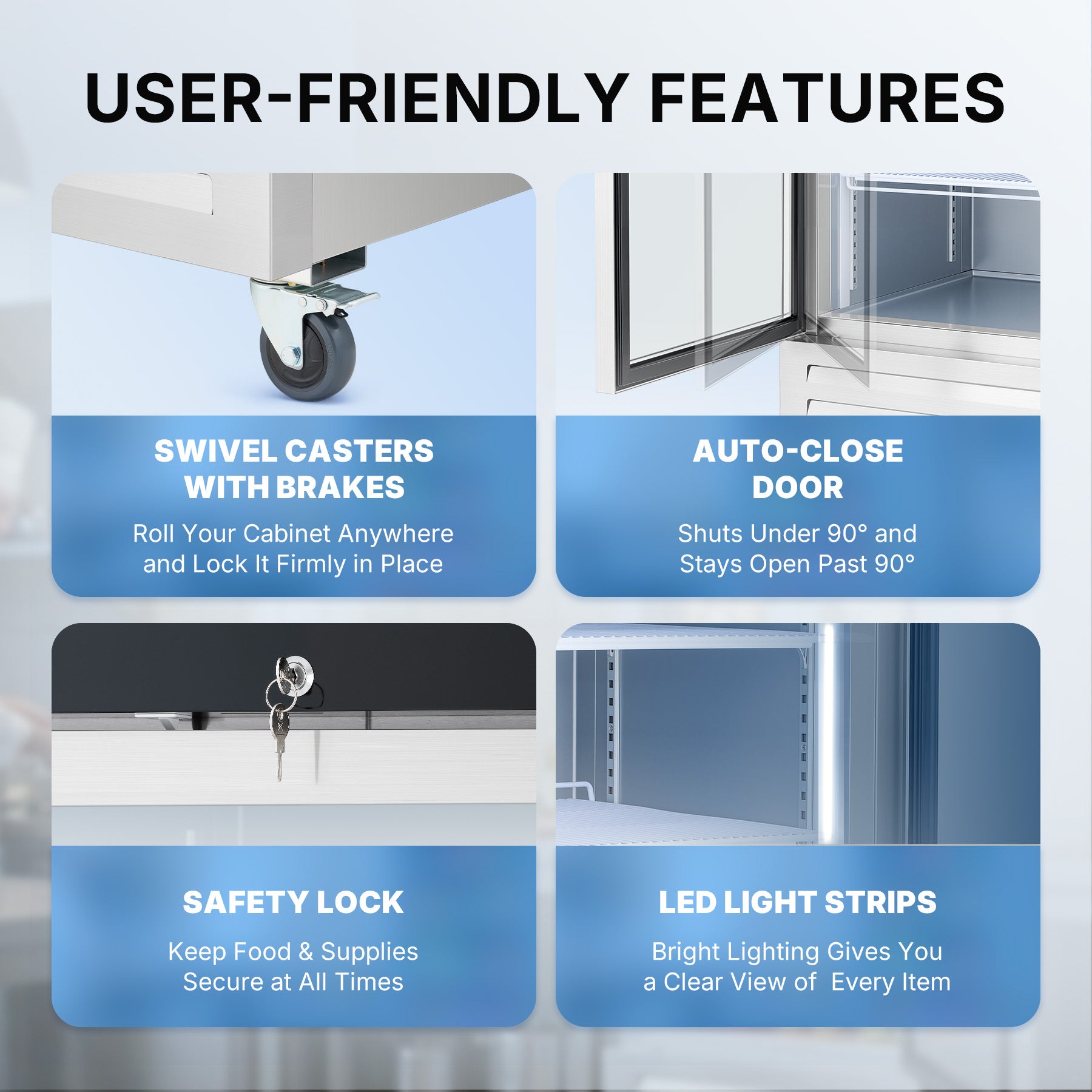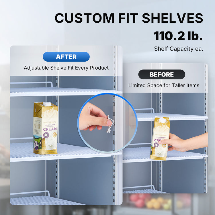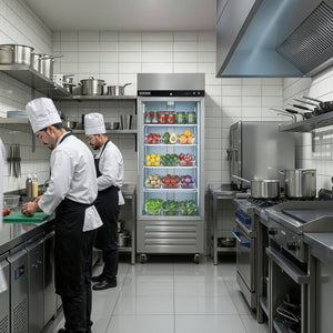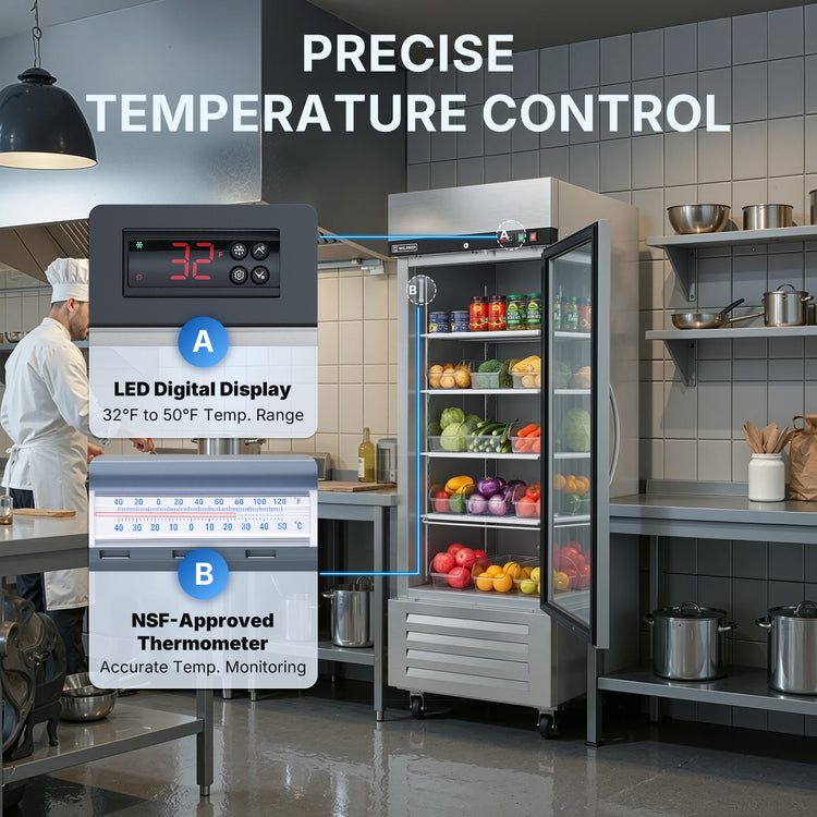 Smart Door & Handy Light Control: This commercial fridge features a smart door that automatically closes when opened to 90° or less and remains open when opened past 90°. The separate light switch allows you to enhance product presentation and optimize energy usage with a simple flick.