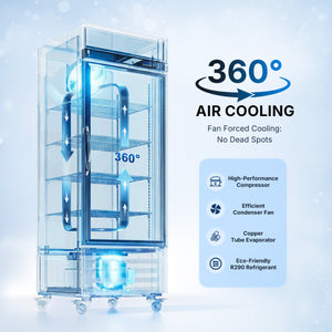 Efficient Air Cooling System: The Embraco compressor and copper evaporator work together to ensure fast, even cooling and optimal temperature levels throughout your commercial display refrigerator, while the auto defrost design prevents frost or ice buildup.