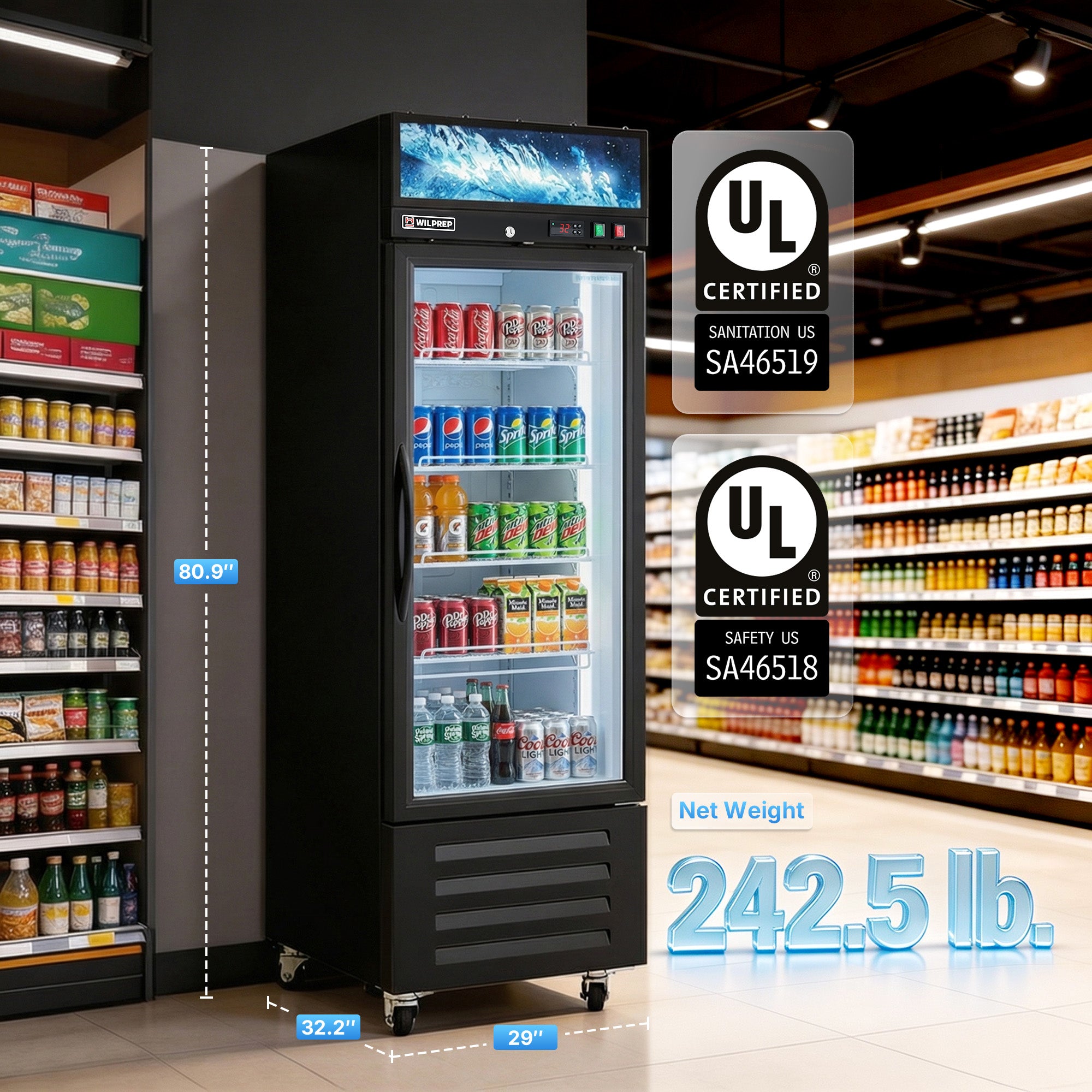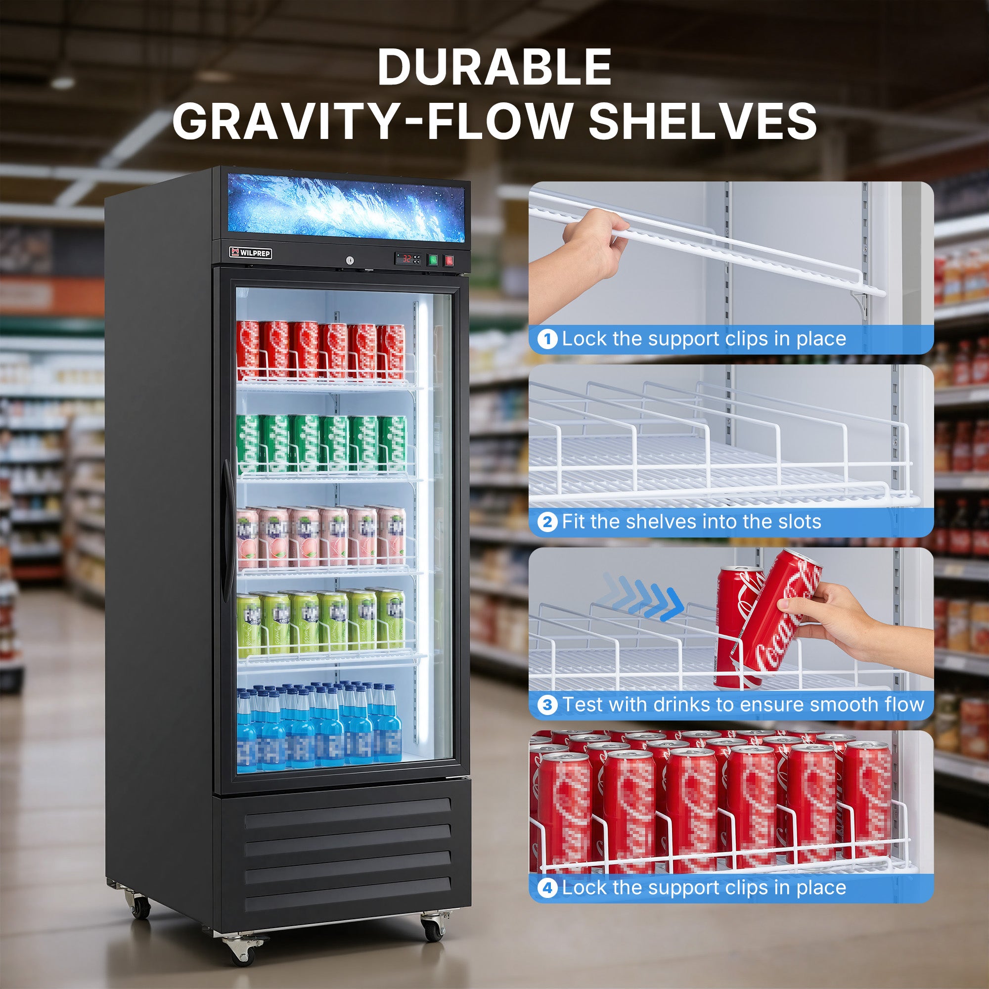 Every Bottle Fits: Keep drinks and snacks chilled and organized! With 23.3 cu. ft. of volume and 4 adjustable shelves, Wilprep's 29 in. single-door commercial display refrigerator lets you store sodas, beers, and snacks in the perfect layout.