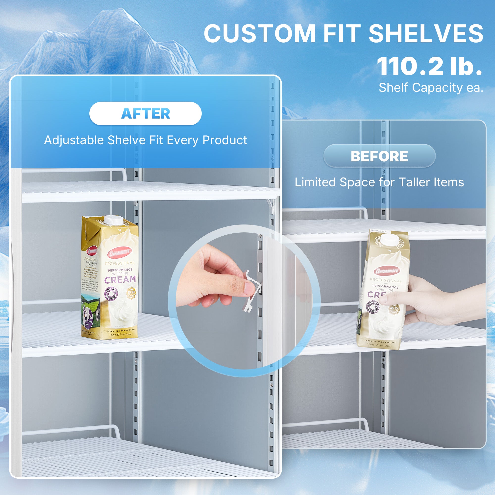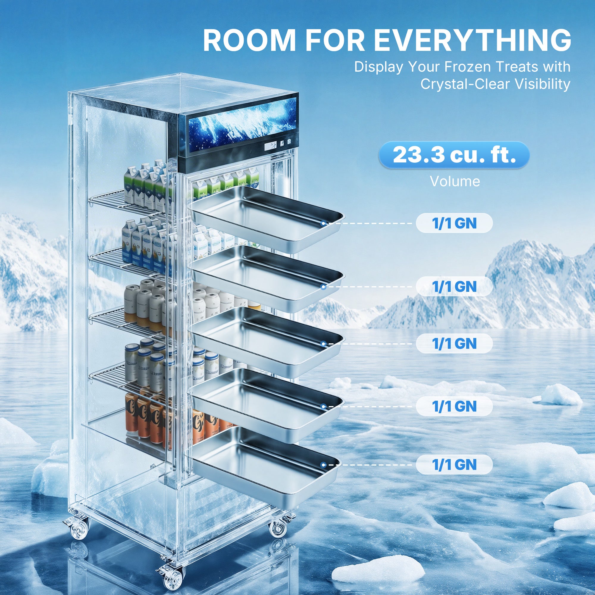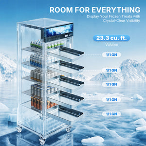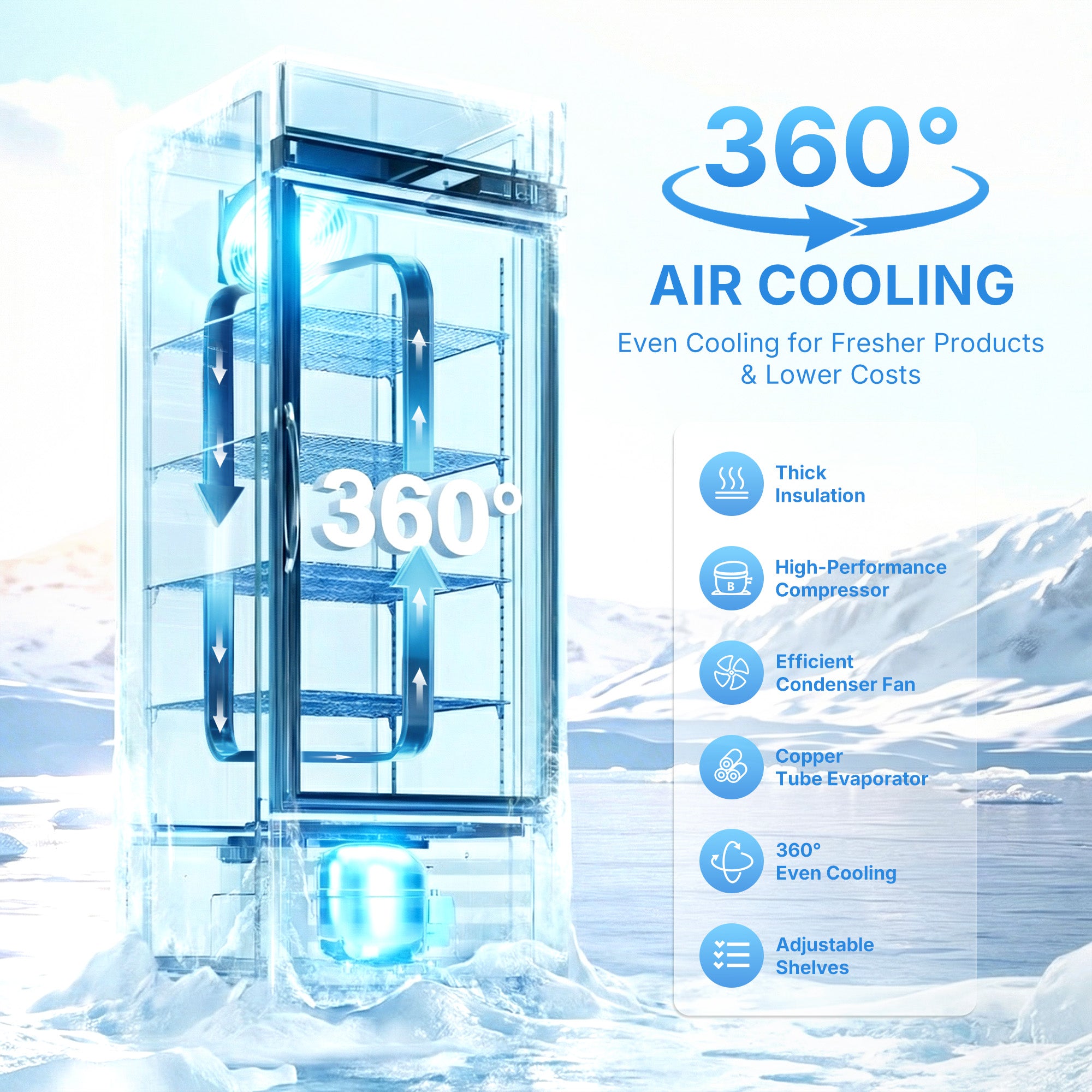 Spotlight Your Drinks: Our double-layer Low-E tempered glass keeps every drink in full view without frost or fog. The customizable top LED panel shows off your brand or specials, making your commercial fridge impossible to miss.