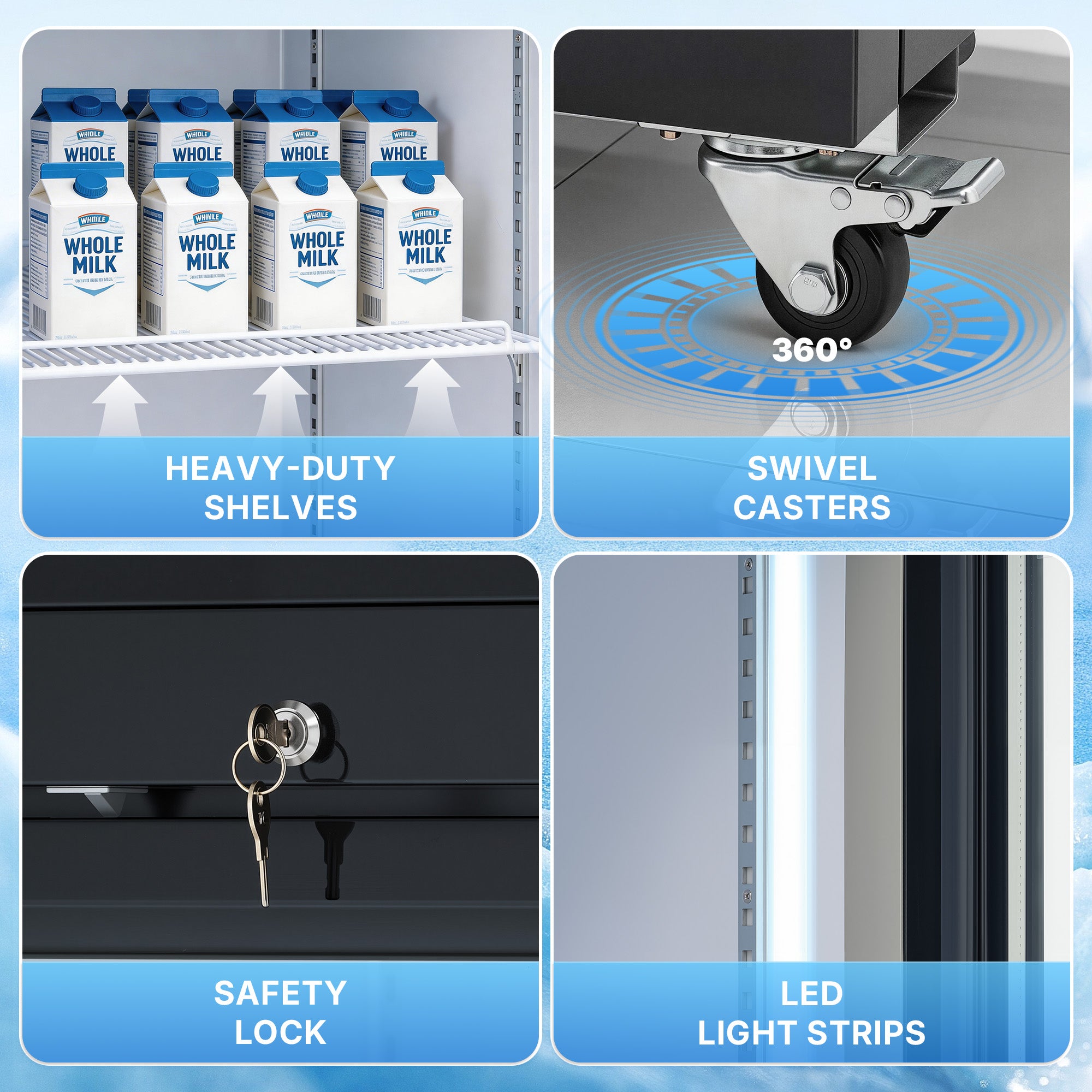 Roll & Lock: Easily move our commercial glass door refrigerator on 2.5 in. swivel casters, two with brakes to hold it steady. Once it's in place, the built-in lock and self-closing doors keep drinks secure and maintain perfect temperatures at all times.