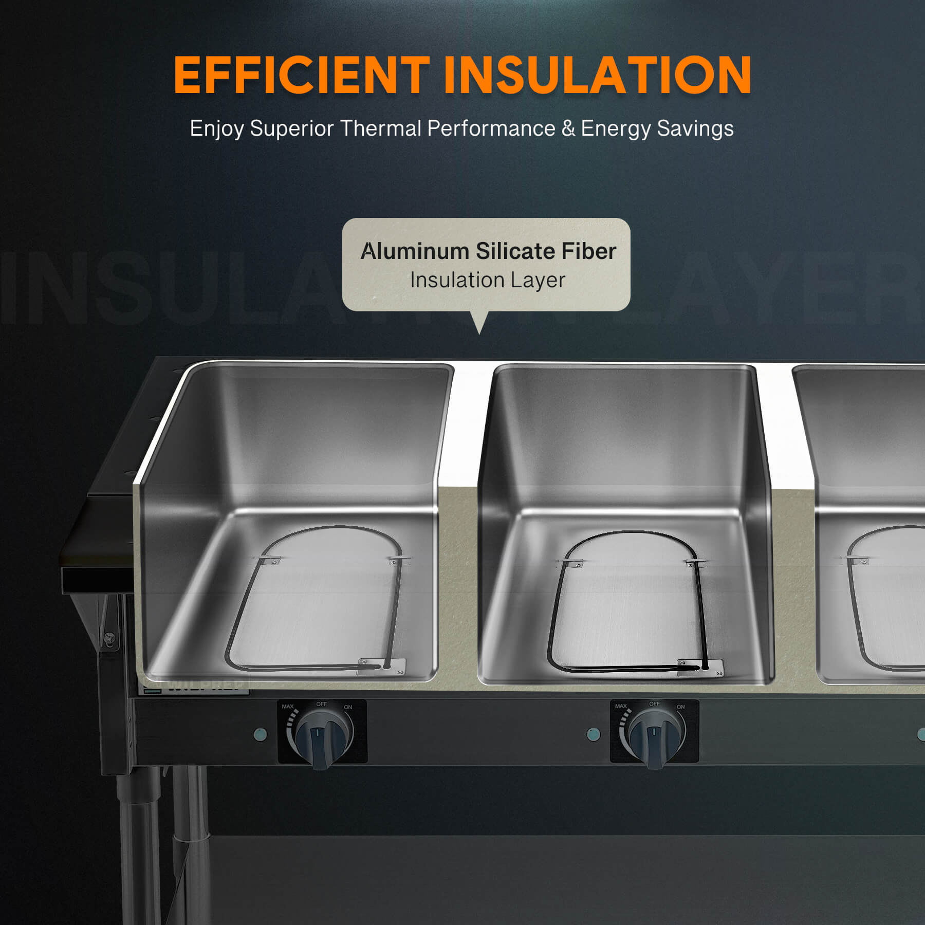 Superior Insulation: Enjoy prolonged warmth for your meals thanks to our commercial food warmer's aluminum silicate fiber insulation layer, keeping your dishes hot and inviting while operating with minimal electricity usage.