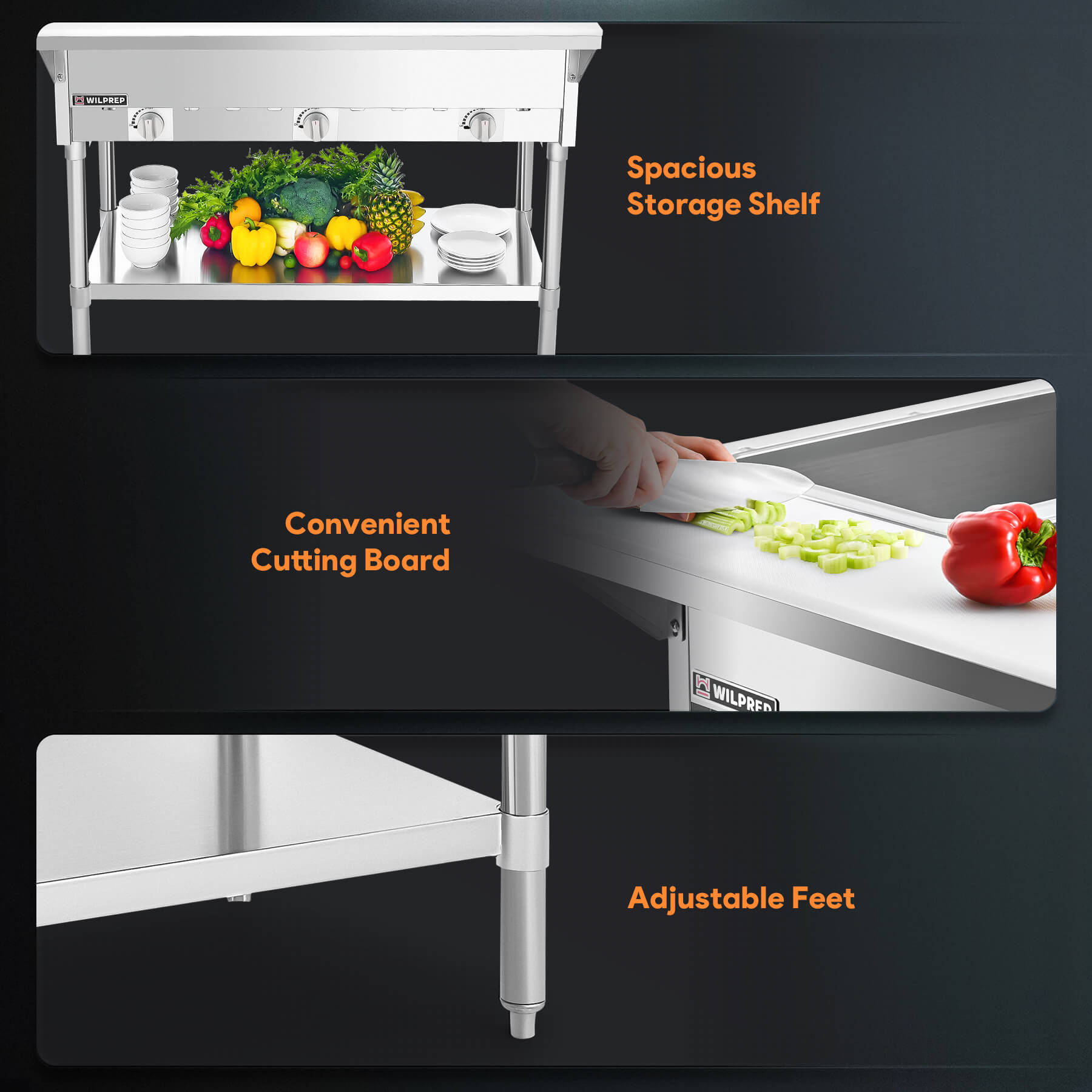 Safer, More Convenient Use: Certified by ETL & ETLs, this stainless steel food warmer is highly resistant to corrosion and stains. Plus, the integrated 30"x8" cutting board allows you to prep ingredients right at the table or effortlessly change out pans.