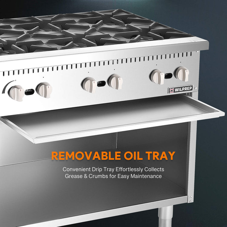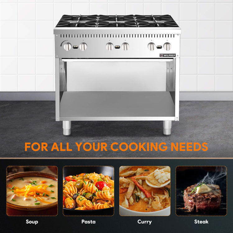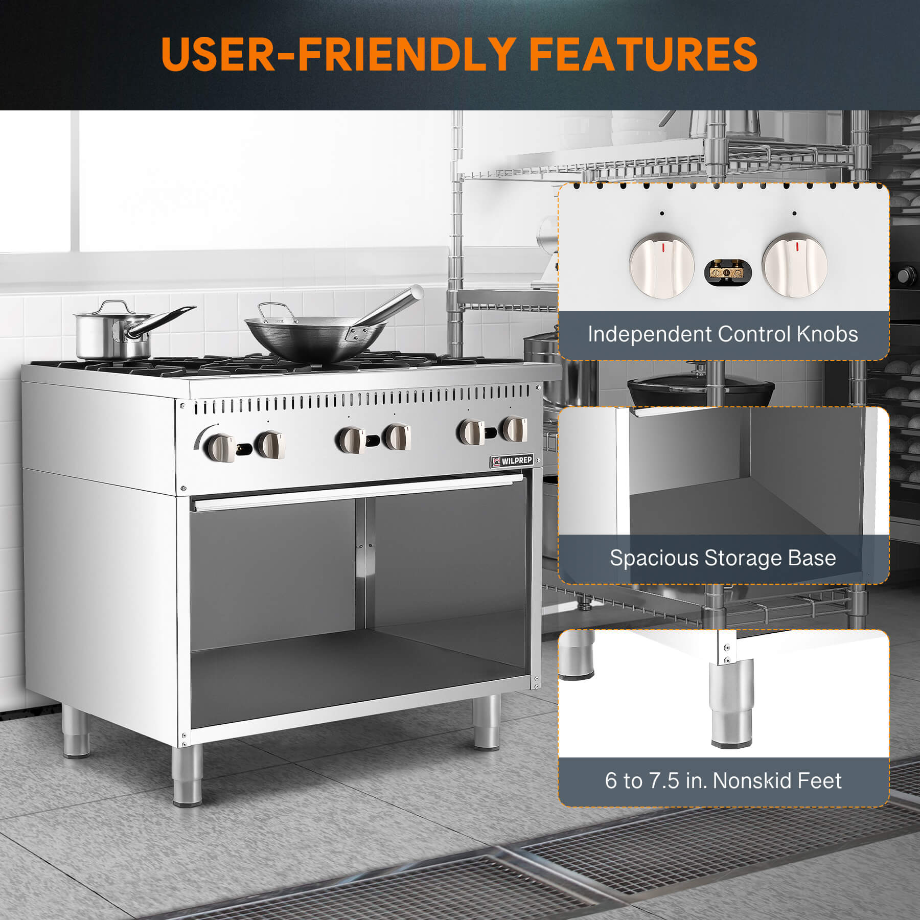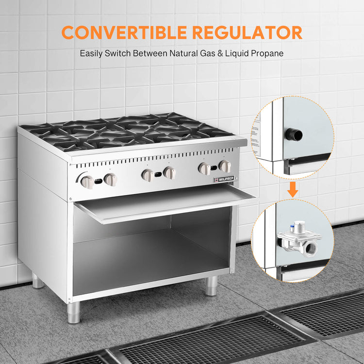 Speed Up Your Cooking: This 36 in. 6-burner commercial gas range by Wilprep provides additional cooking space for simultaneous meal preparation. Easily switch between NG and LPG with the gas regulator for added convenience.