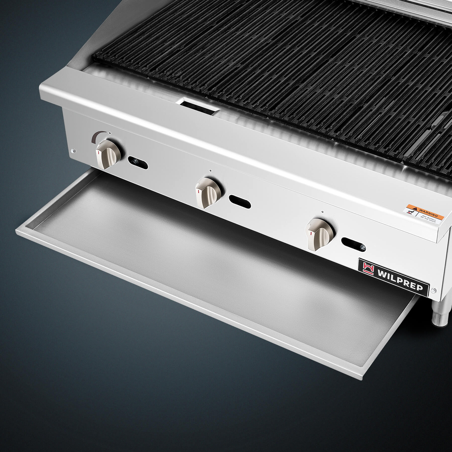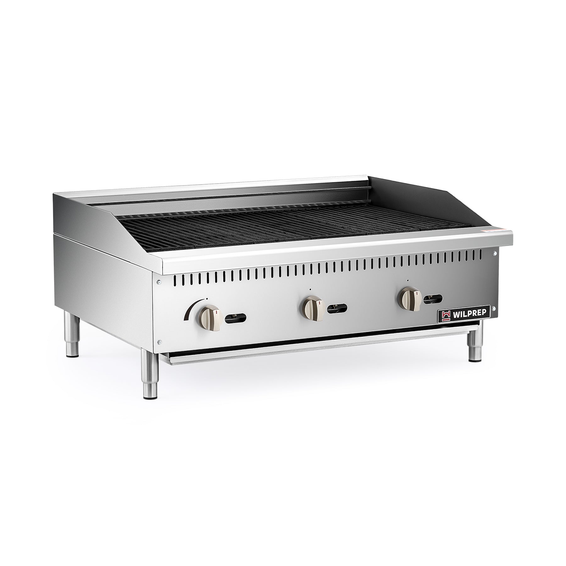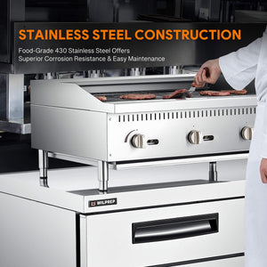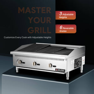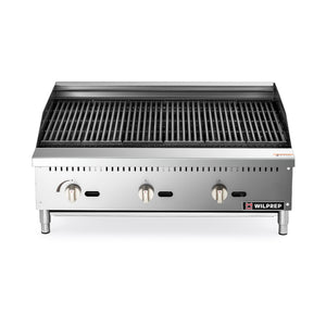 Wilprep's 36 in. countertop radiant charbroiler, heated by three 35,000 BTU U-shaped burners, ensures speedy and uniform broiling. Perfect for effortlessly preparing a range of delights, from juicy burgers to charred vegetables.