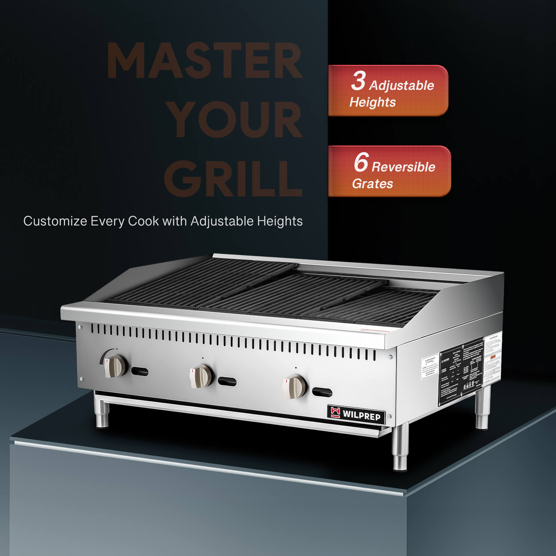 Get perfect grill marks on any dish using our gas radiant charbroiler's six reversible cast iron grates. With our innovative three-adjustable height design, cooking everything from thin slices to thick steaks is a breeze.