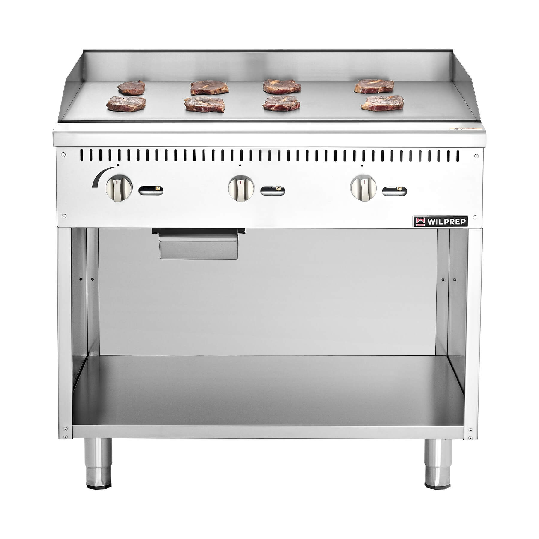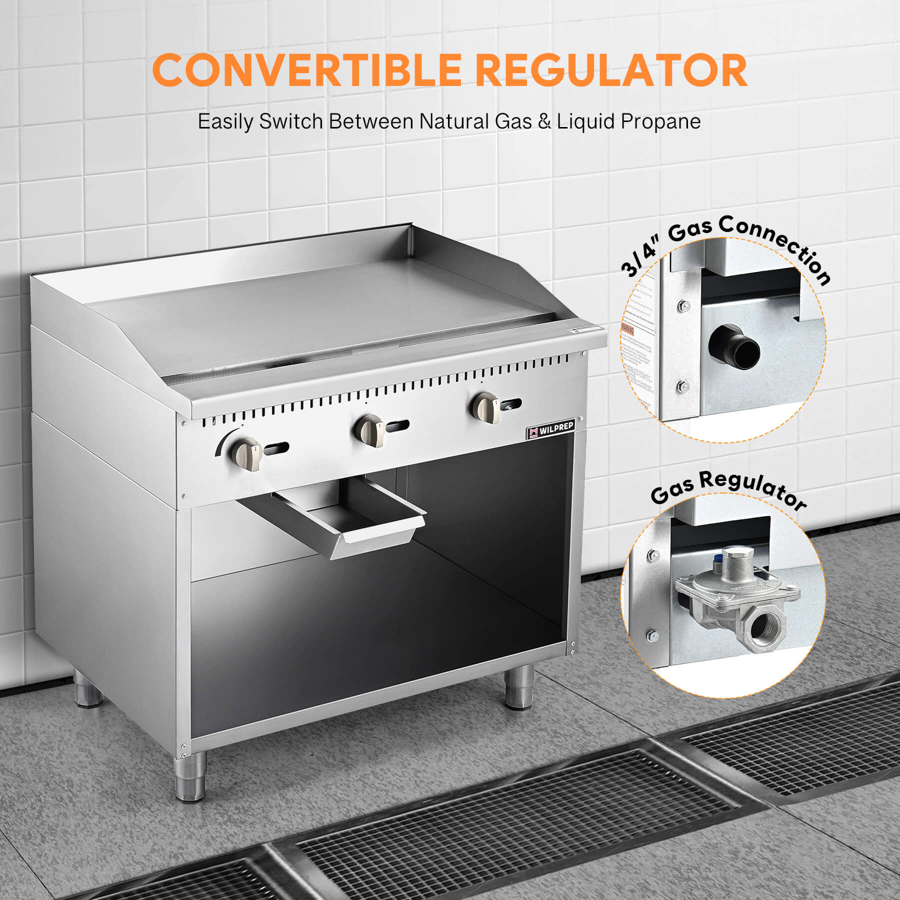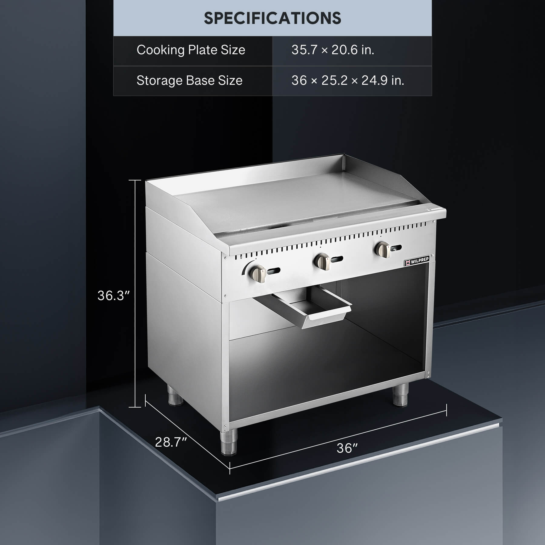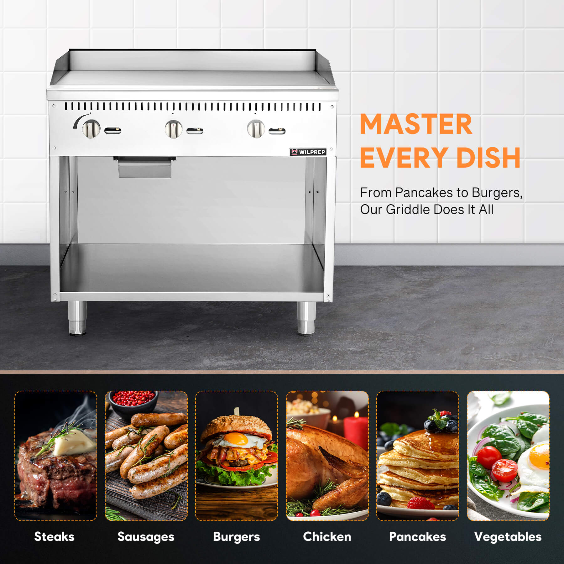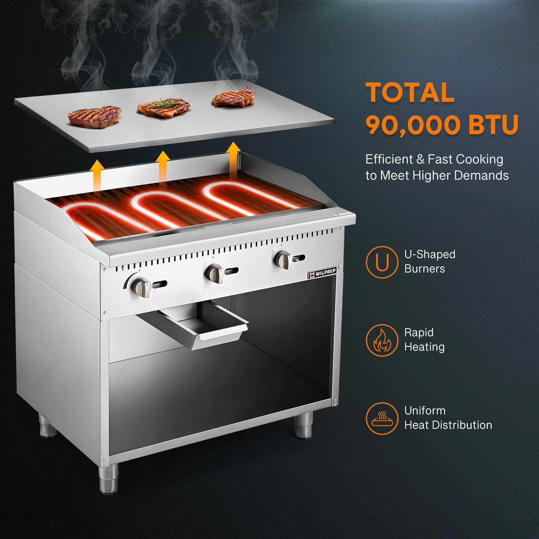 Efficient Delicacy Preparation: This 36-inch gas griddle with cabinet base by Wilprep features two powerful 30,000 BTU U-shaped burners and an expansive 35.7 x 20.6-inch cooking surface, enabling efficient handling of large batches of diverse dishes in any culinary setting.