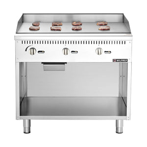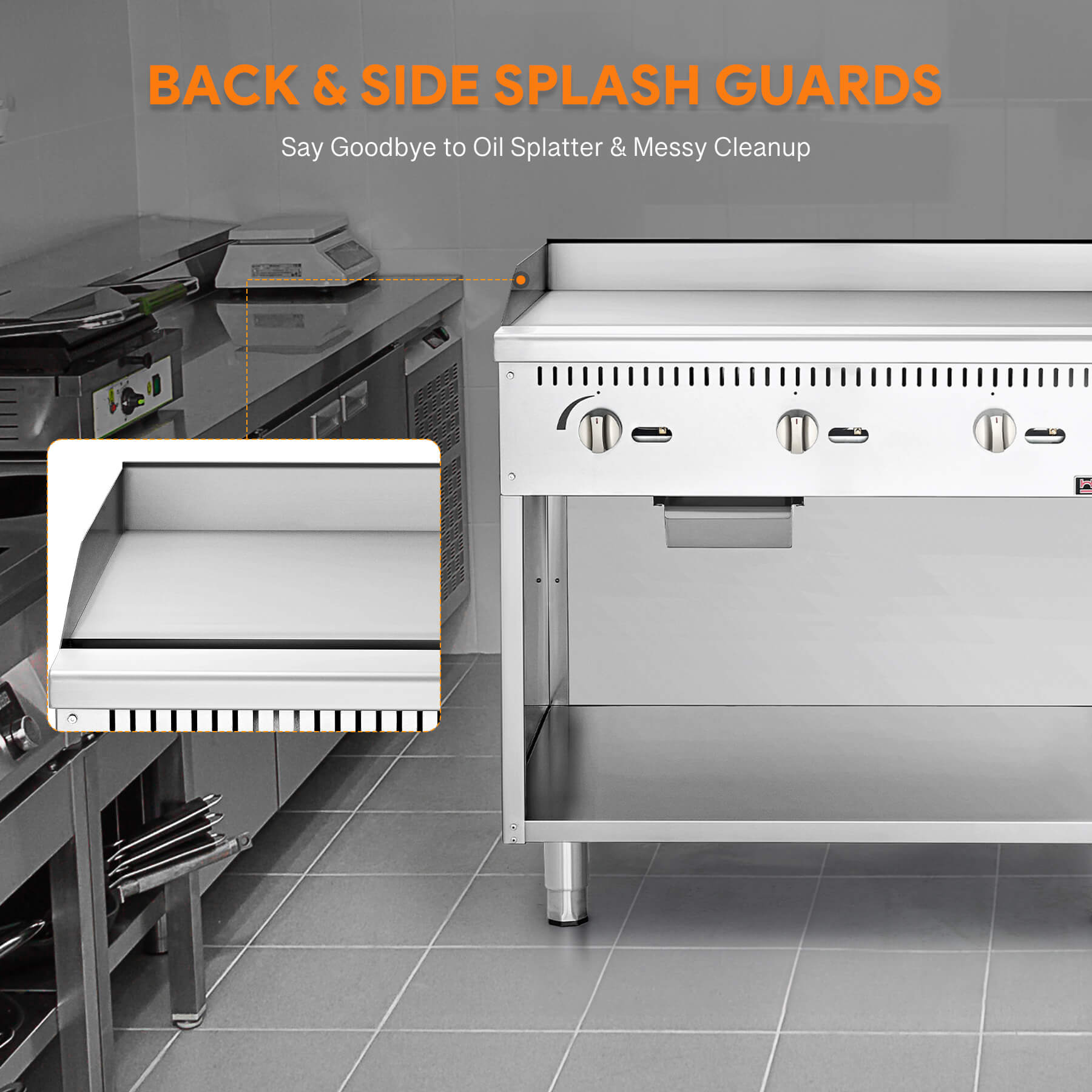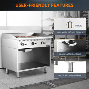 Spacious Storage Base: This commercial gas griddle features a spacious open storage space below, making it a breeze to keep your pots, pans, and cooking essentials right where you need them for all your daily cooking needs.