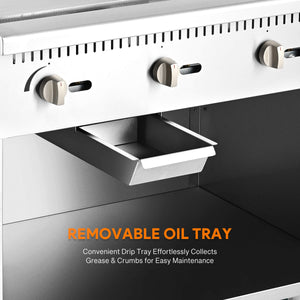 User-Friendly Features: Equipped with an easily removable waste tray spanning the full width, this stainless steel gas griddle effectively collects grease and food residue. The adjustable support feet allow you to customize the height from 6 to 7.5 in. for the perfect fit in your kitchen.