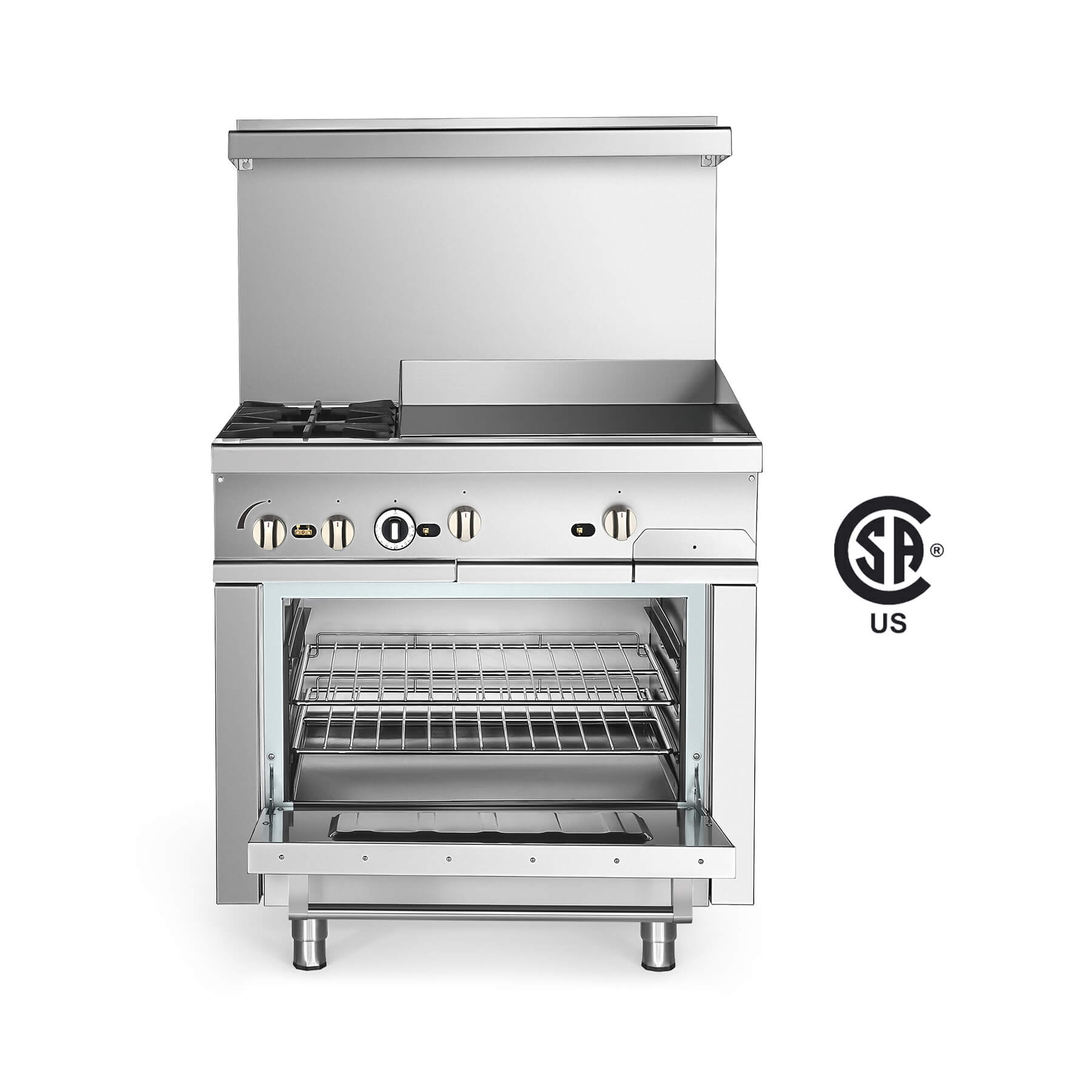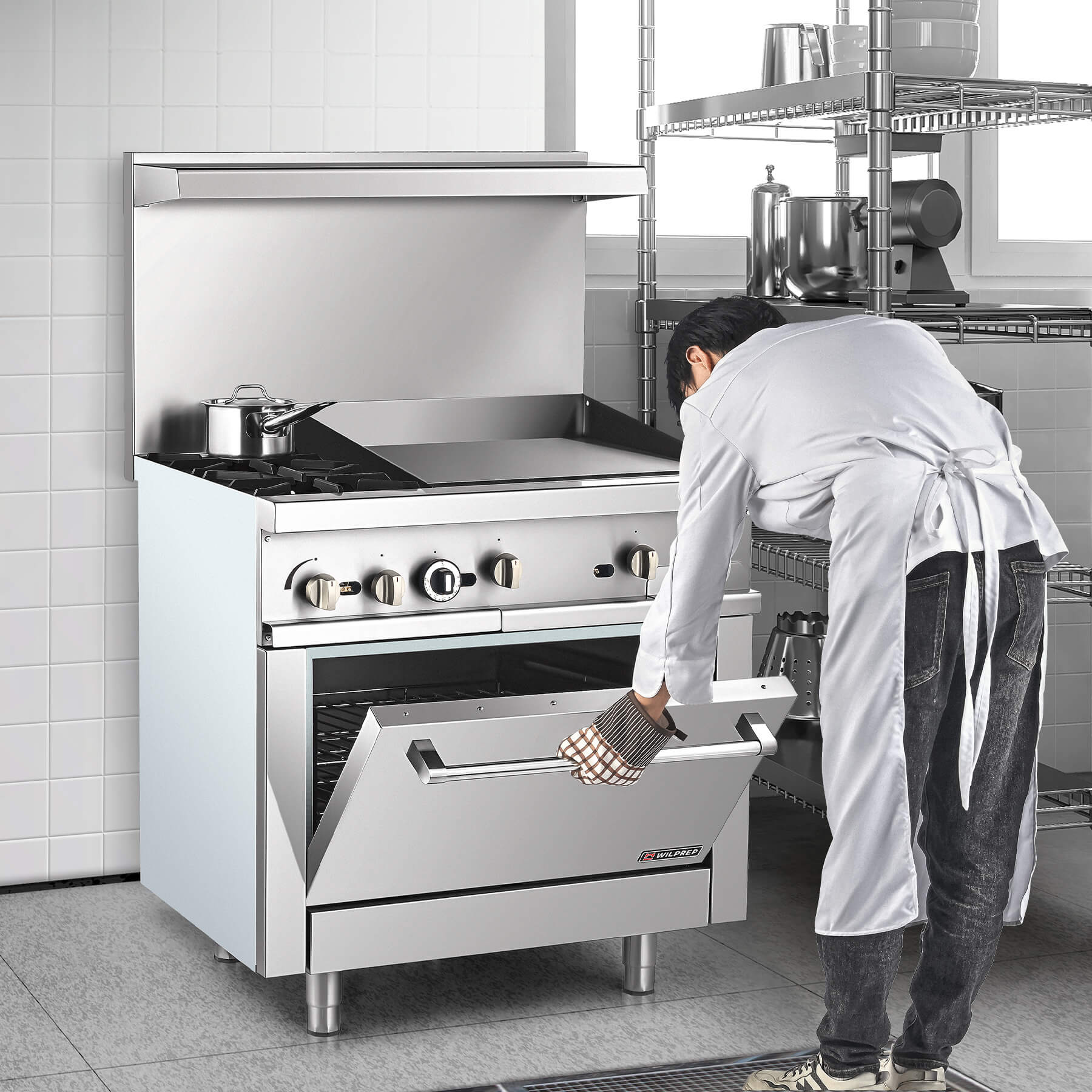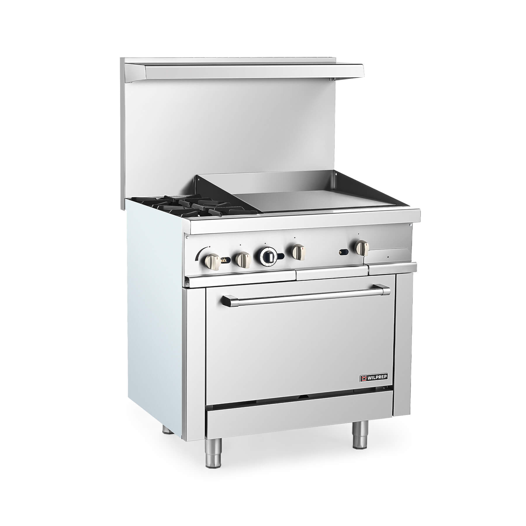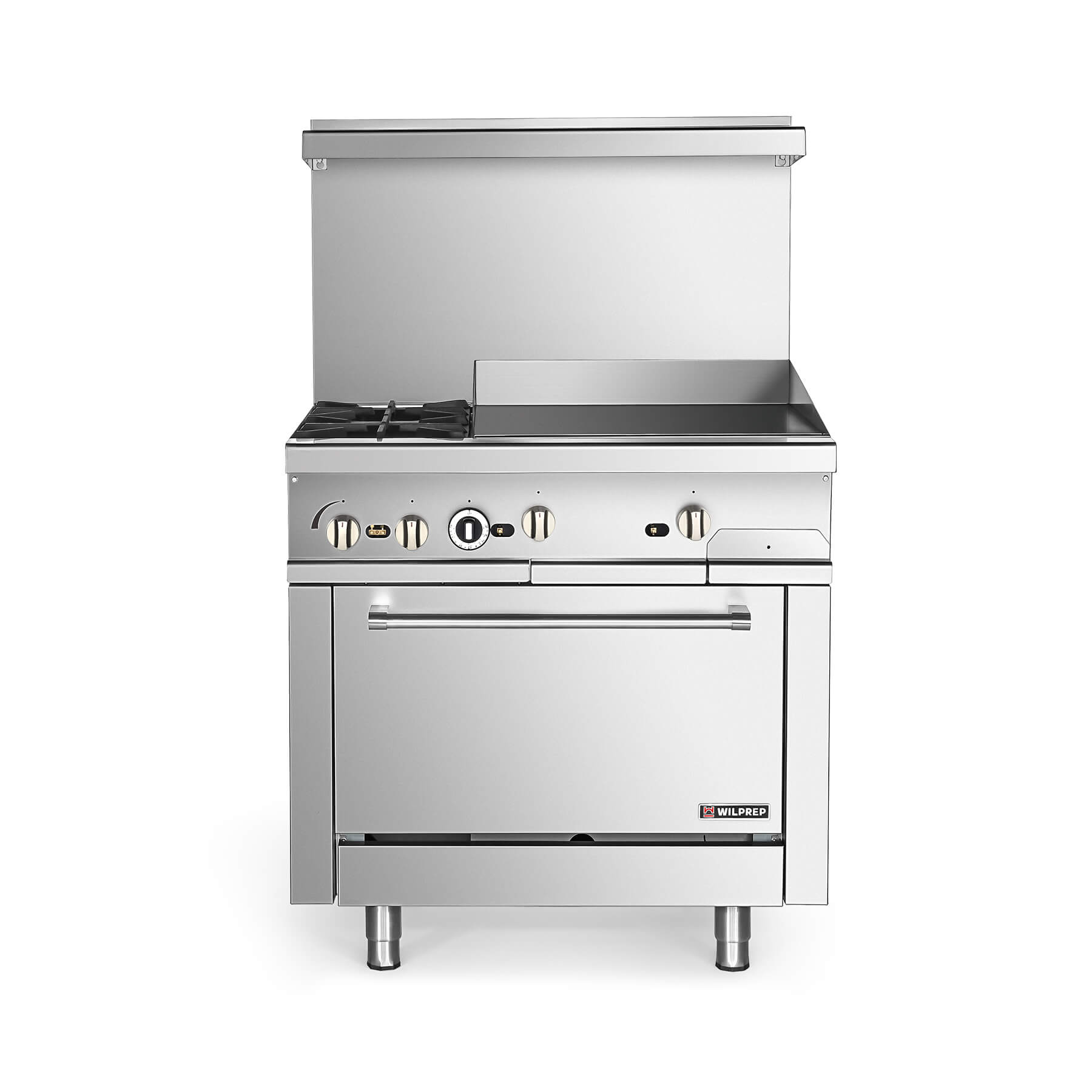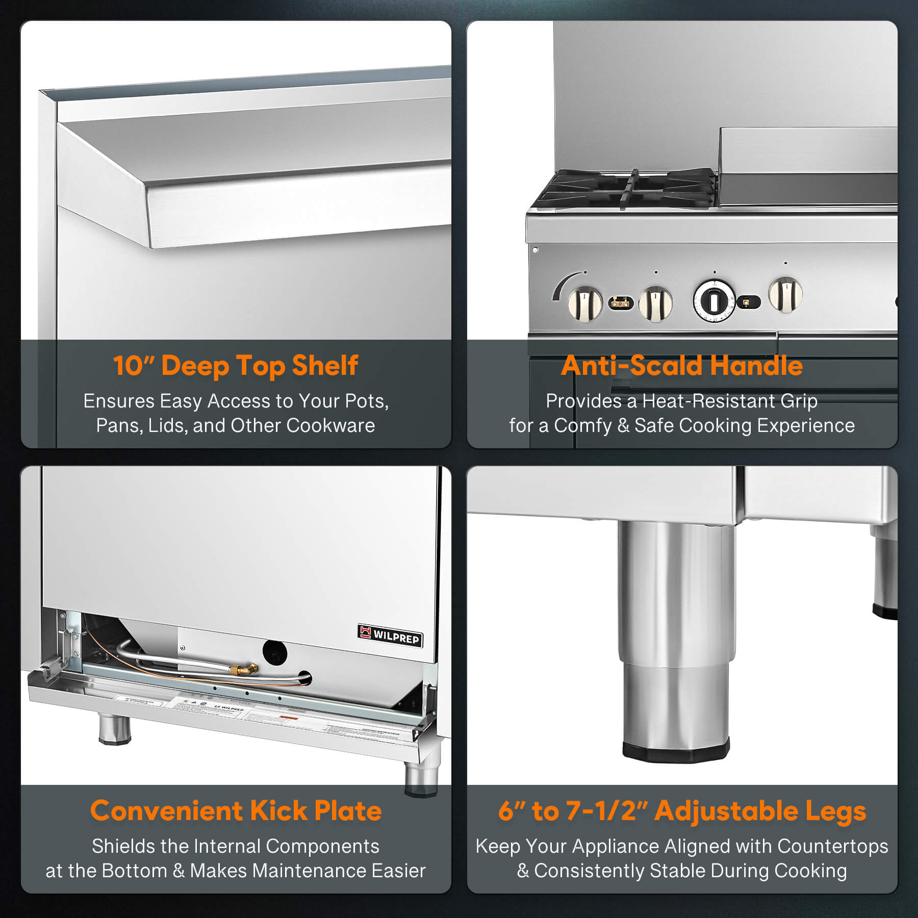 Boost Kitchen Productivity: This liquid propane gas range by Wilprep features a spacious oven and 12" griddle, enabling simultaneous cooking tasks such as simmering soups, frying steak, baking cookies, or roasting chicken even during peak hours.
