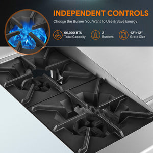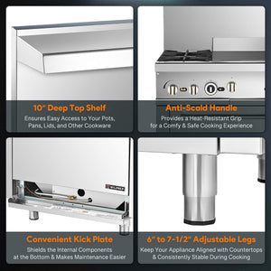 Optimal Culinary Efficiency: Our commercial stove has 4 burners, delivering a total of 120,000 BTUs for a consistent flow of delicious meals. Experience versatile cooking options with removable grates that support your pots, pans, and other cookware.