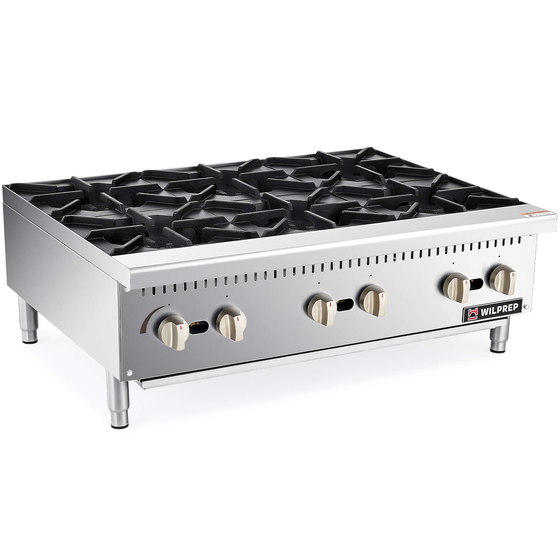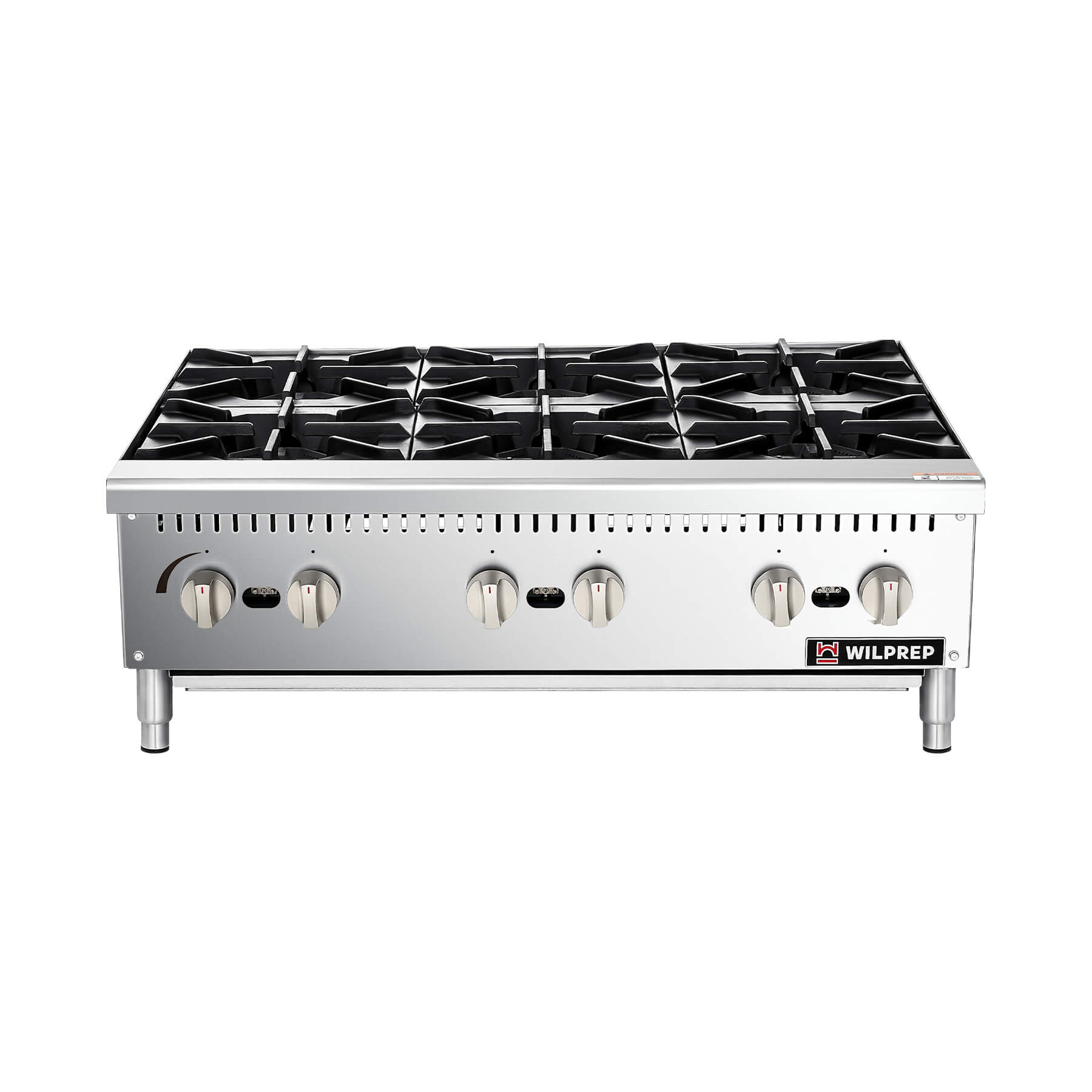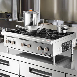 Boost your culinary efficiency with Wilprep's countertop gas range, featuring 6 burners that deliver a total of 150,000 BTUs. Enjoy instant ignition through the standing pilots and ensure a consistent flow of delicious meals even during peak hours.