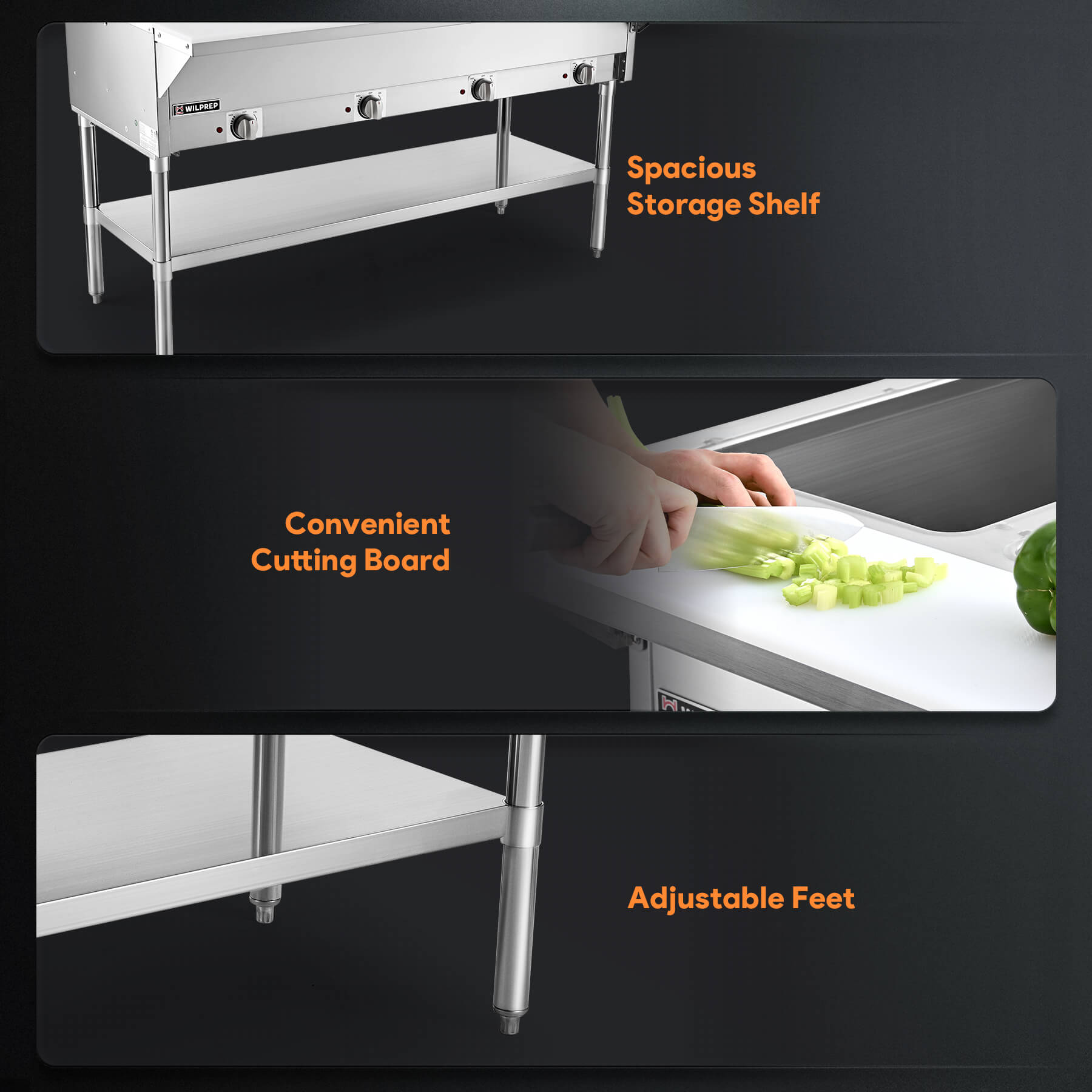 - Safer, More Convenient Use: Certified by ETL & ETLs, this stainless steel steam table is highly resistant to corrosion and stains. Plus, the integrated 58"x8" cutting board allows you to prep ingredients right at the table or effortlessly change out pans.