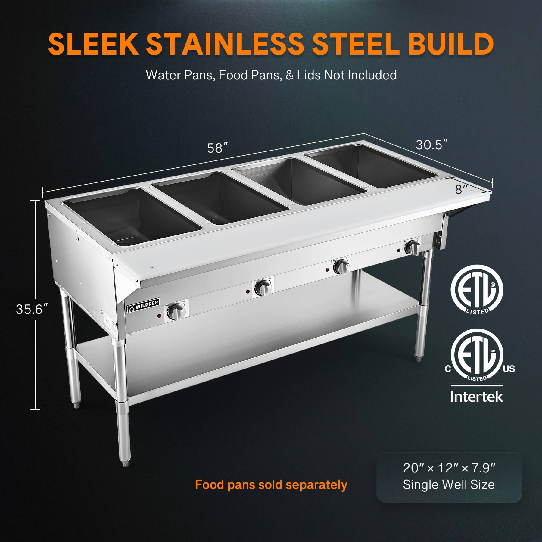 - Safer, More Convenient Use: Certified by ETL & ETLs, this stainless steel steam table is highly resistant to corrosion and stains. Plus, the integrated 58"x8" cutting board allows you to prep ingredients right at the table or effortlessly change out pans.