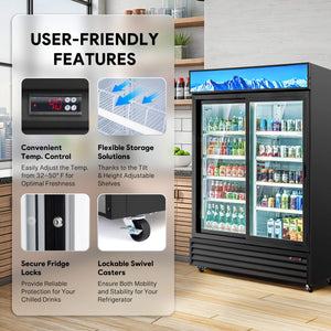 User-Friendly Features: Easily adjust temperatures from 32°F to 50°F with our intuitive control panel for precise cooling. Keep your beverages secure with the dependable fridge locks, and enjoy effortless mobility and stability thanks to the lockable casters.