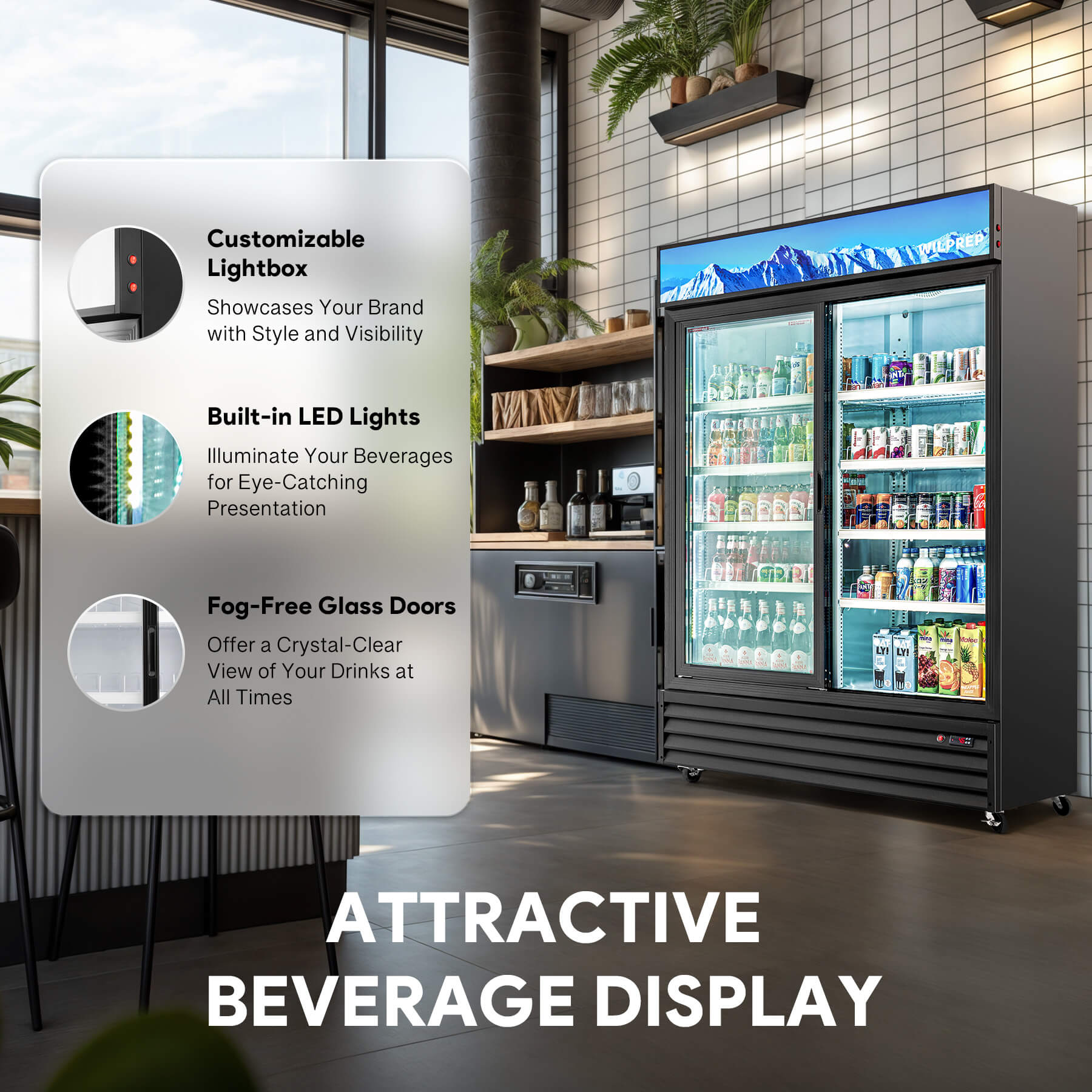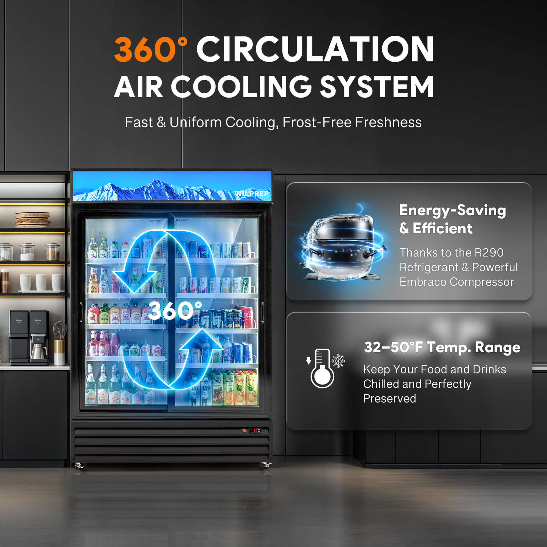 Perfectly Chilled Drinks: Keep your drinks perfectly chilled and displayed with Wilprep's ETL listed display refrigerator. Its advanced air cooling system ensures fast, even cooling without frost buildup, while the Embraco compressor with R290 refrigerant provides high efficiency and energy savings for long-term reliability.