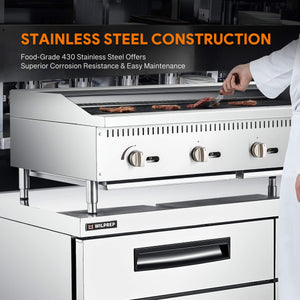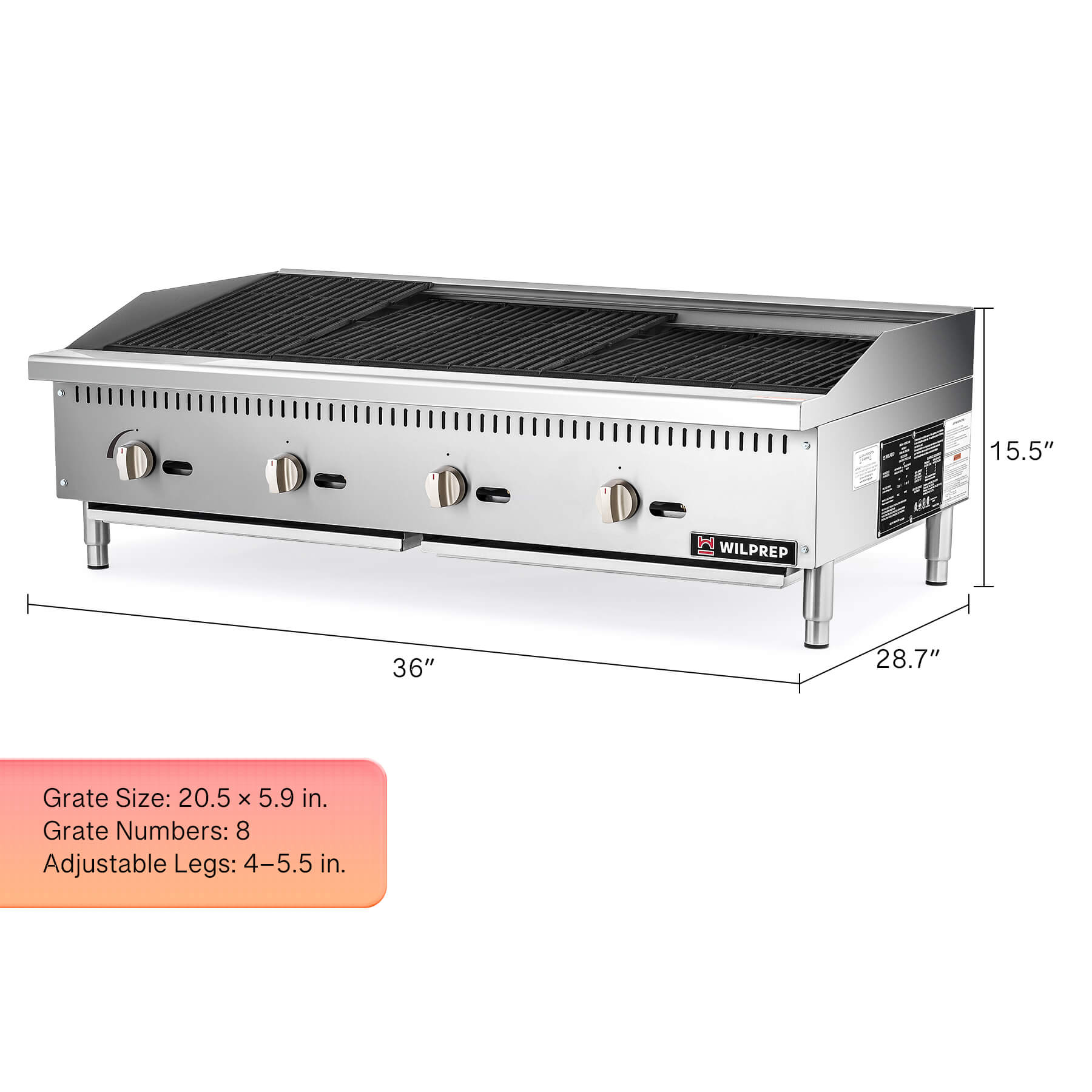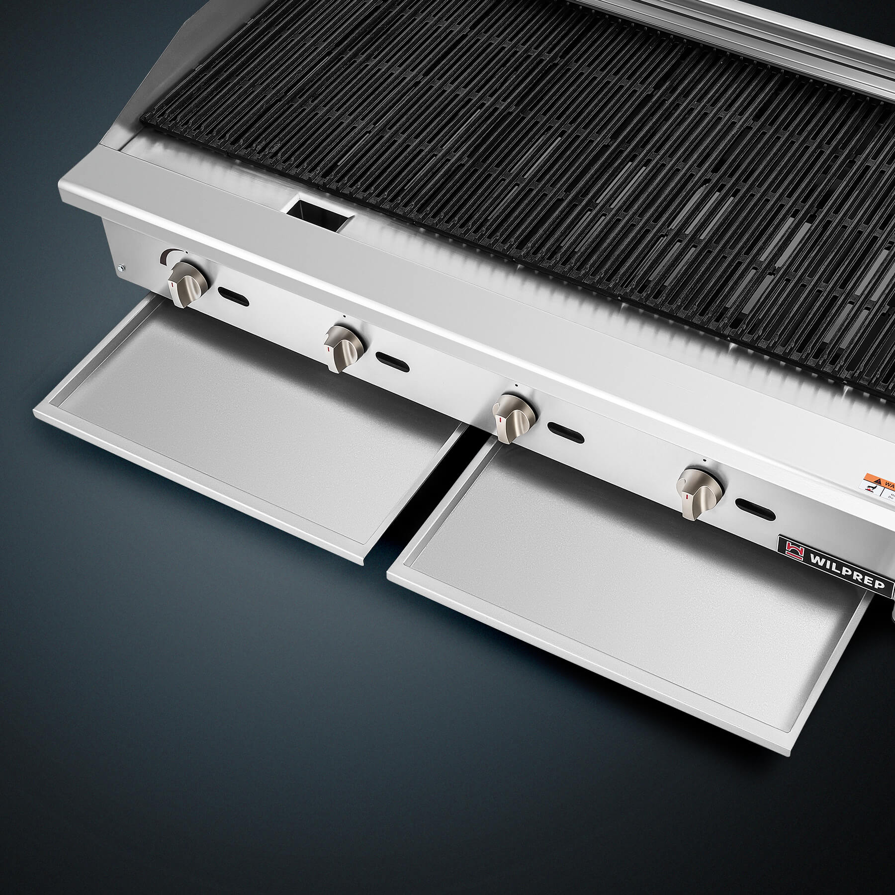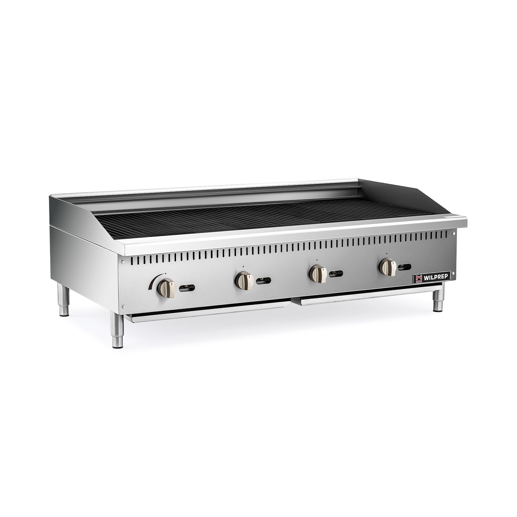 Wilprep's 48 in. countertop radiant charbroiler, heated by four 35,000 BTU U-shaped burners, ensures speedy and uniform broiling. Perfect for effortlessly preparing a range of delights, from juicy burgers to charred vegetables.