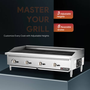 Get perfect grill marks on any dish using our gas radiant charbroiler's eight reversible cast iron grates. With our innovative three-adjustable height design, cooking everything from thin slices to thick steaks is a breeze.