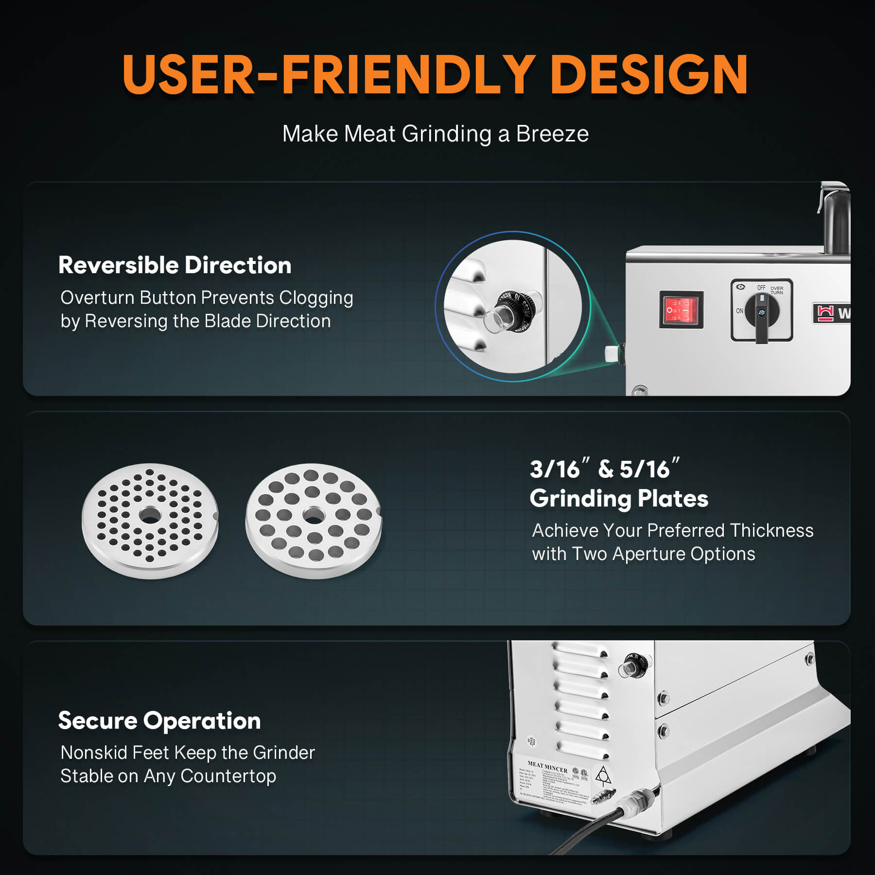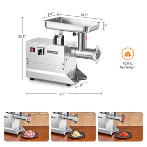 - Enhanced Safety: Engineered with advanced safety features, including built-in overload protection and a reverse function to prevent clogging, and supported by ETL & ETL Sanitation certifications, this meat mincer ensures compliance with rigorous industry standards.