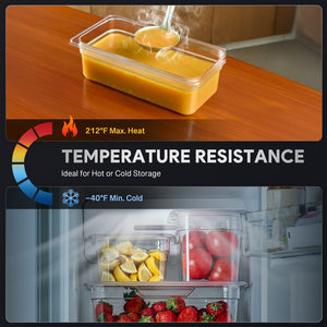 Food-Grade & NSF-Listed: Made from food-grade PC material and NSF-listed for safety, these hotel pans provide a safe, contaminant-free way to store your food. Withstanding temps from -40°F to 212°F, they're perfect for pantry, fridge, or on-the-go use