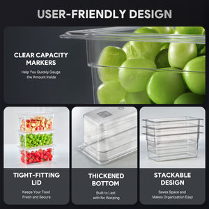 Quick Access & Measurements: With a clear design, our plastic food pans let you easily see what's inside at a glance. The capacity markers on the side make it simple to check inventory and measure portions, making food organization & prep easier than ever