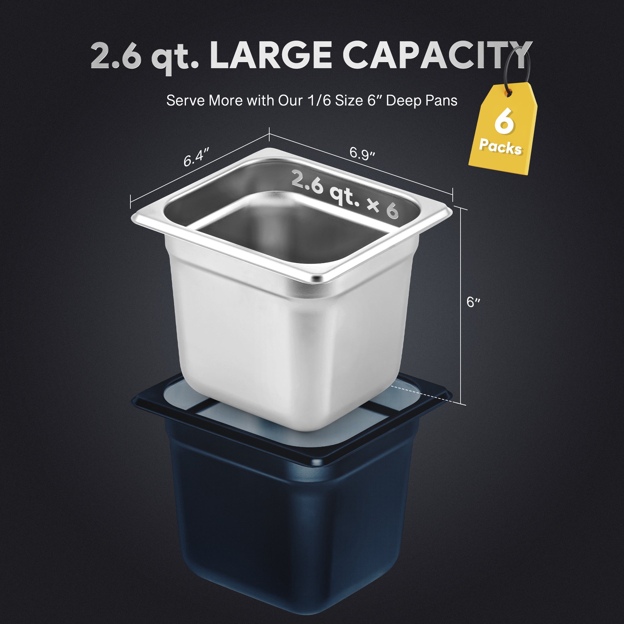 Perfect for Busy Hosts: With a generous 2.6 qt. capacity and 6 in. depth, these 1/6 size pans provide ample space for preparing, storing, and serving everything from delicious entrees to tempting sides—perfect for catering, events, and buffets.