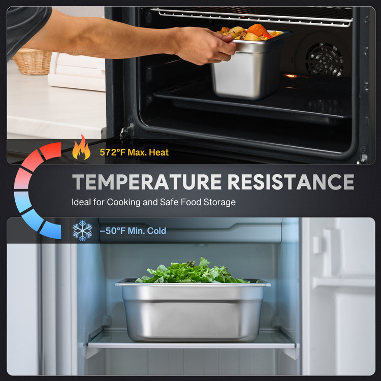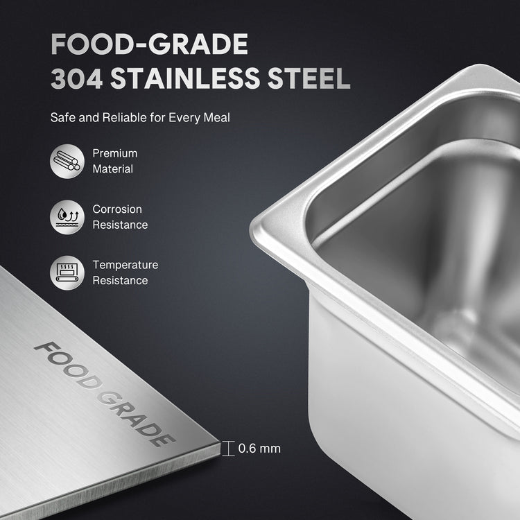 Food-Grade and NSF-Listed: Made from food-grade stainless steel, these hotel pans are NSF certified to ensure safe food prep and storage, free from rust and corrosion. The 0.6 mm thickness resists warping, even under extreme heat.