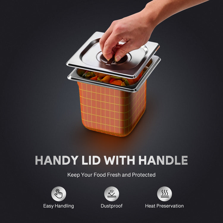 Essential Catering Pans: Make hosting easy with Wilprep's 6-pack of 1/6 size hotel pans with lids. These durable pans keep multiple dishes organized and ready to serve at any occasion, while the handy lids lock in freshness and flavor for easy transport and storage.