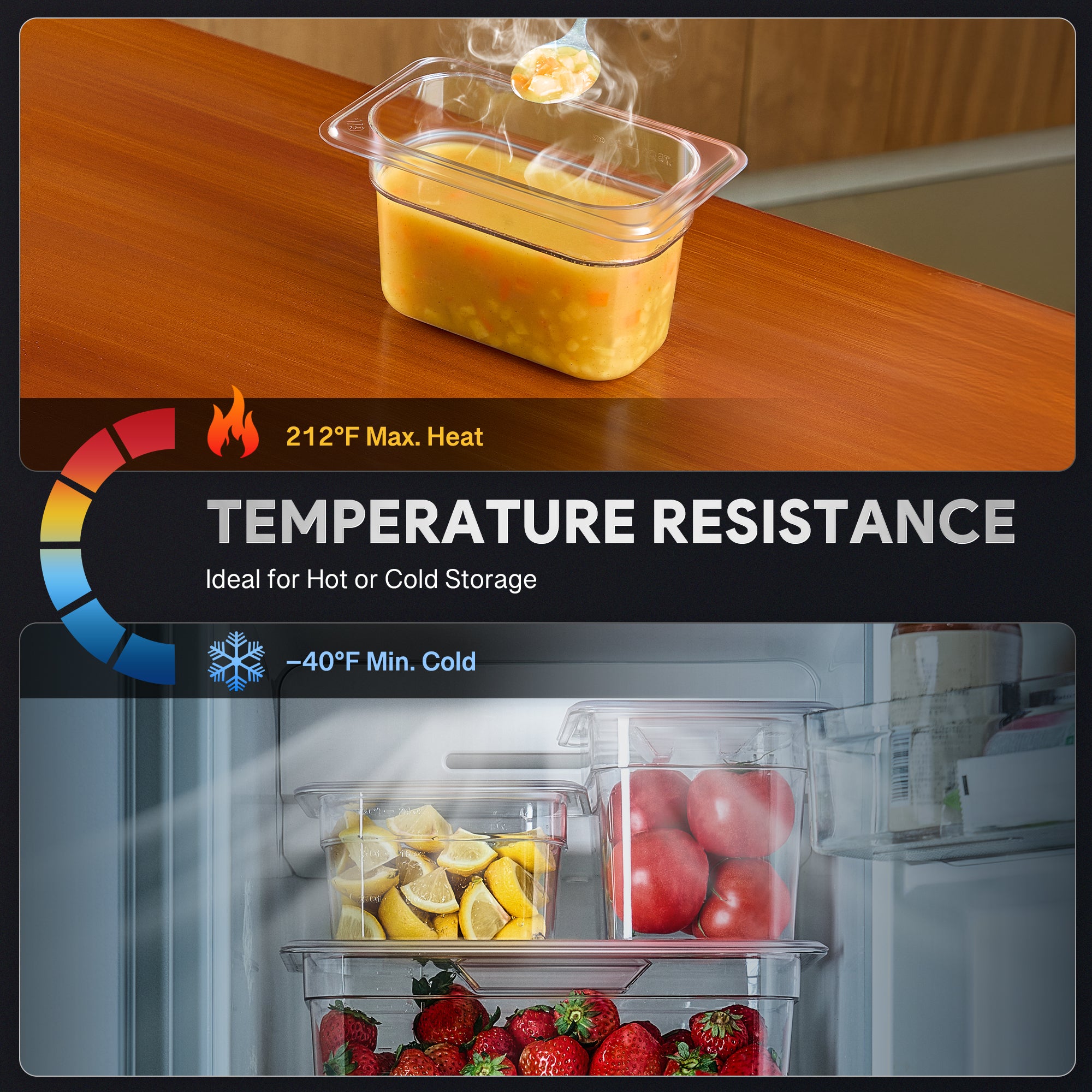 Food-Grade & NSF-Listed: Made from food-grade PC material and NSF-listed for safety, these hotel pans provide a safe, contaminant-free way to store your food. Withstanding temps from -40°F to 212°F, they're perfect for pantry, fridge, or on-the-go use