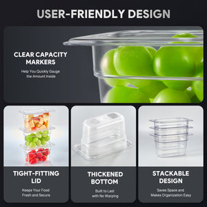 Quick Access & Measurements: With a clear design, our plastic food pans let you easily see what's inside at a glance. The capacity markers on the side make it simple to check inventory and measure portions, making food organization & prep easier than ever