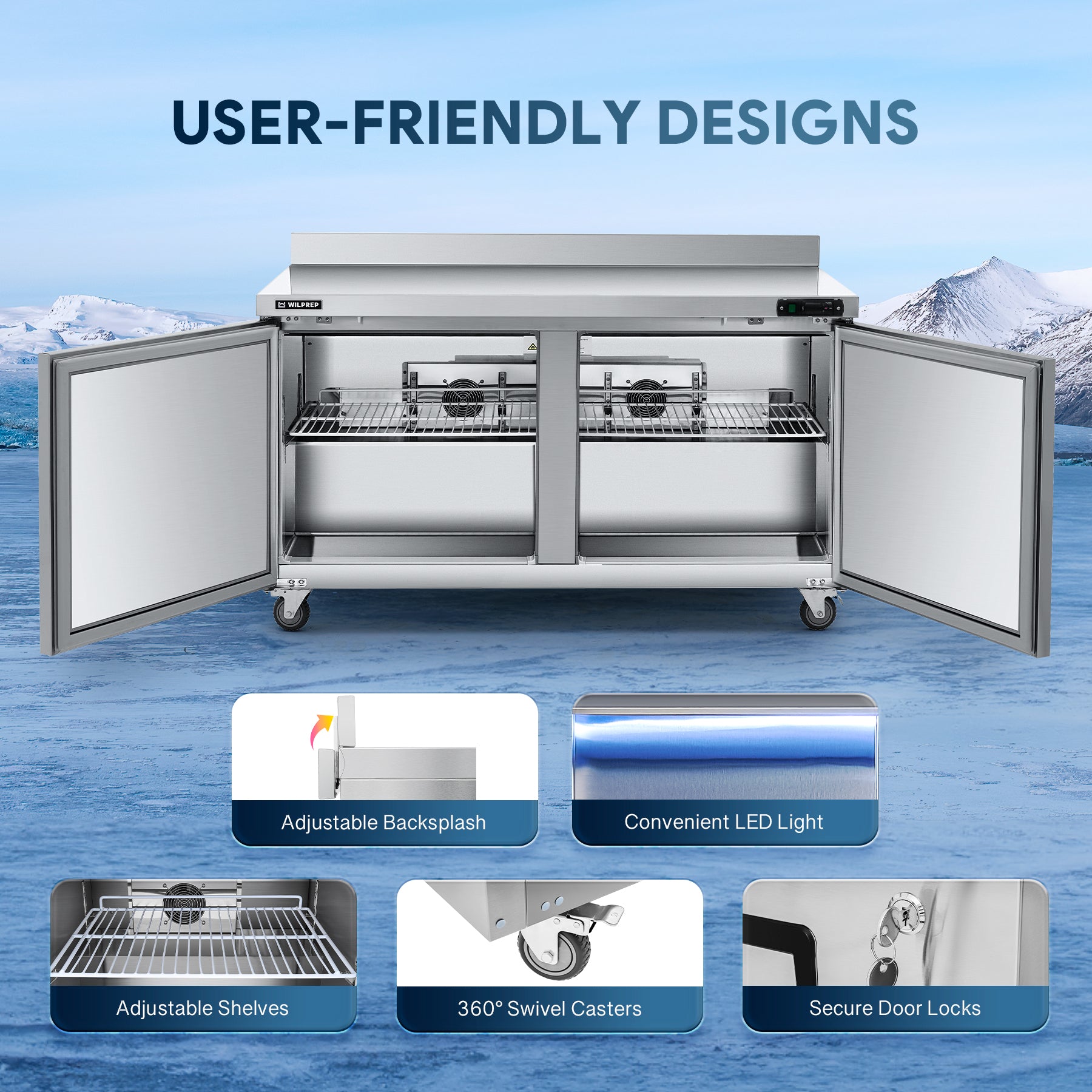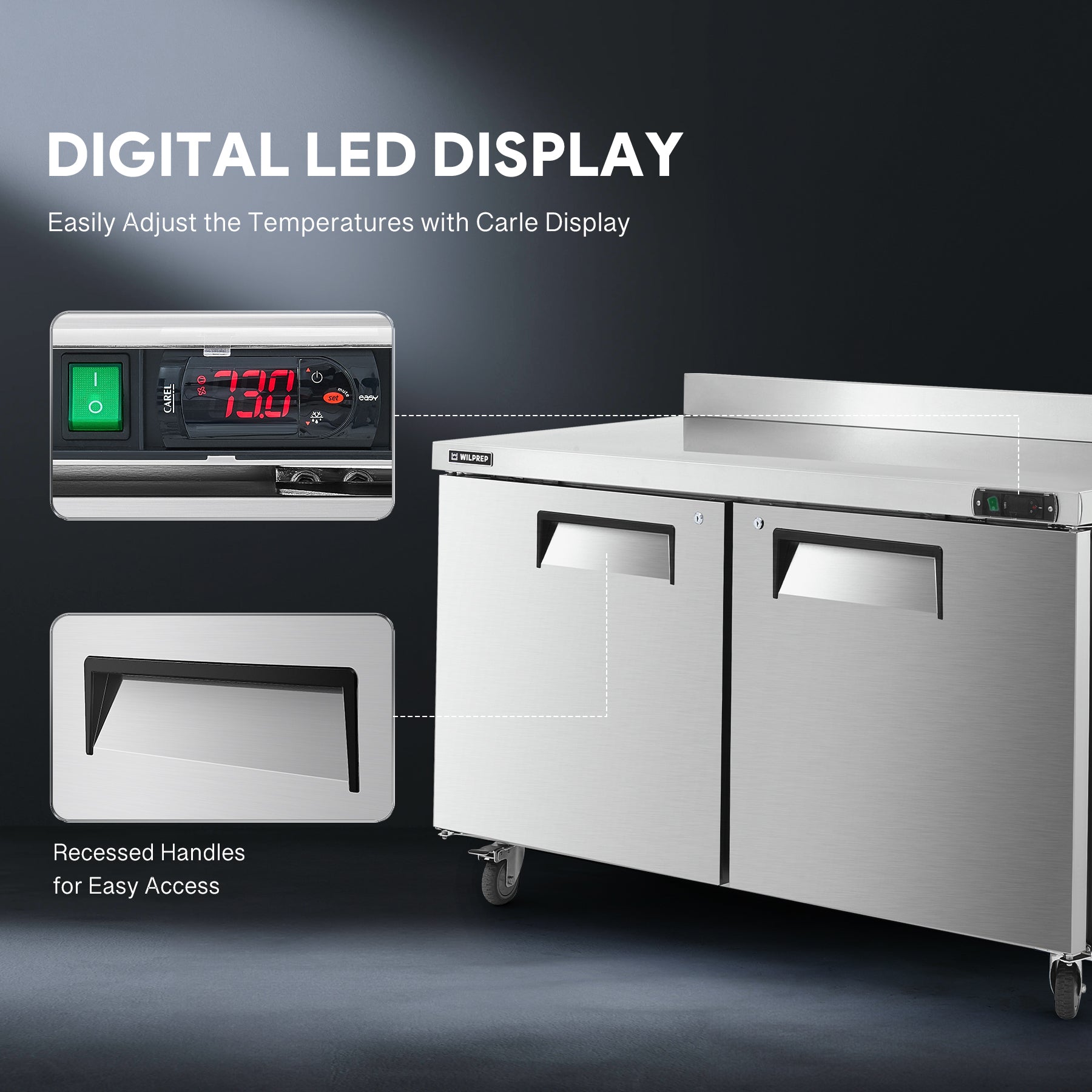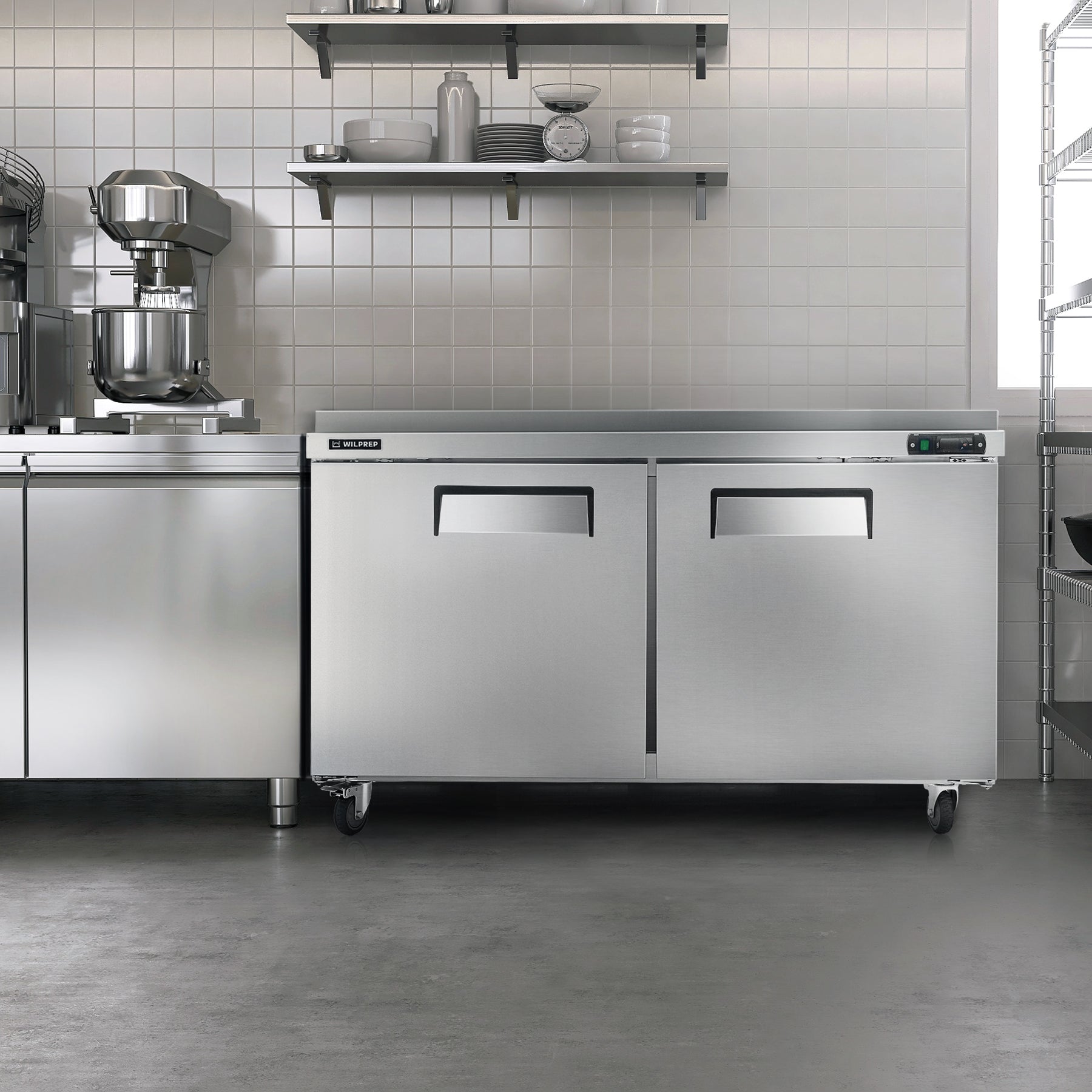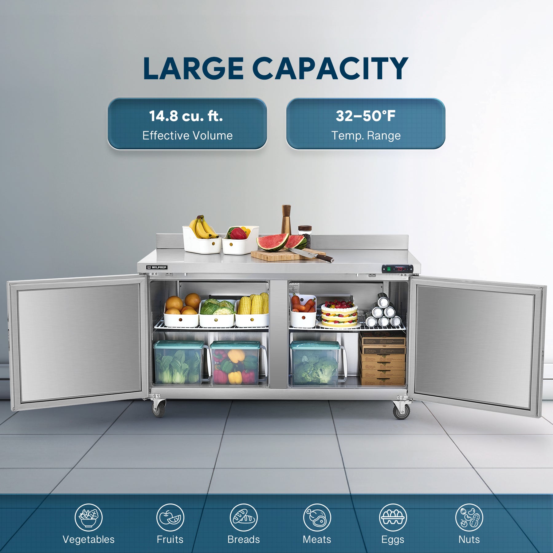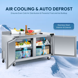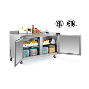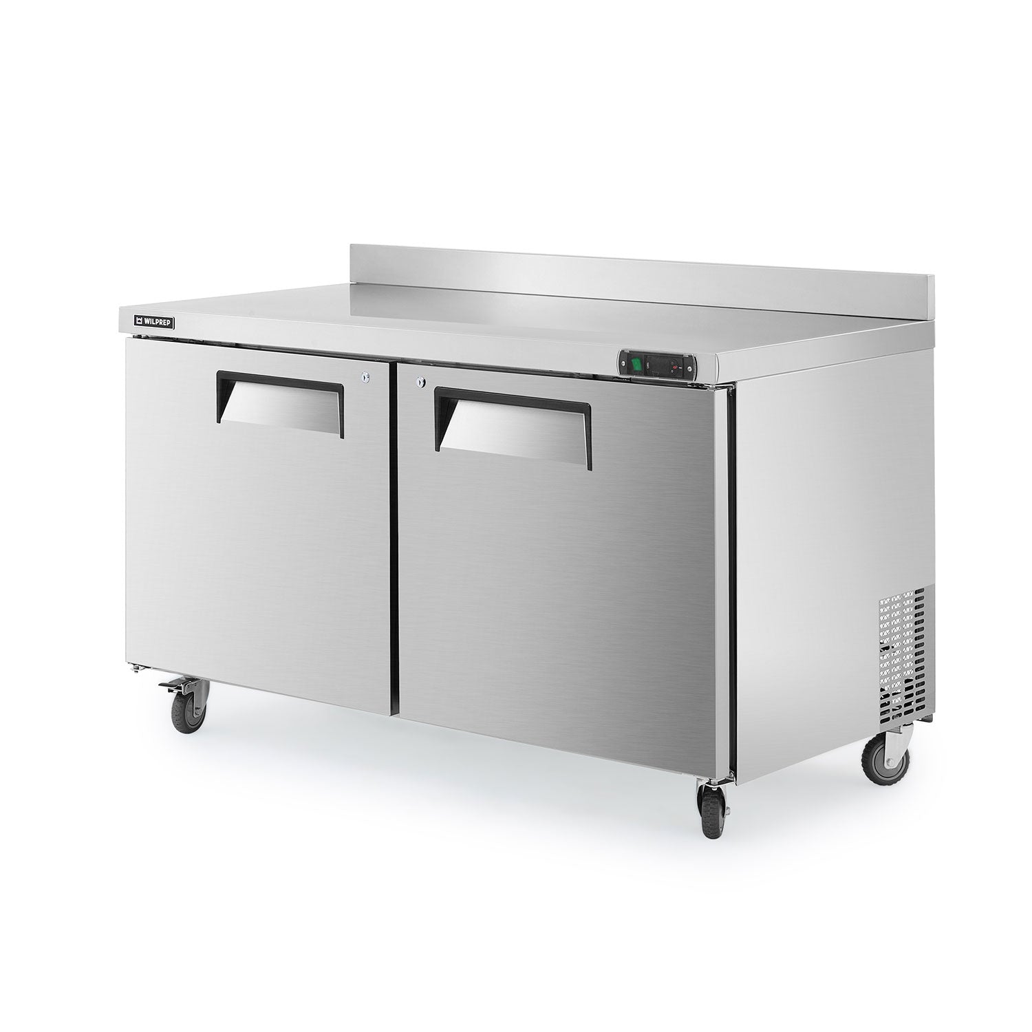 Worktop Refrigerator for All Your Needs: Wilprep's 60" double door undercounter refrigerator, with a 14.8 cu. ft. capacity and a temperature range of 32 to 50°F, allows you to properly store eggs, milk, & fresh produce while simultaneously preparing your dishes on the worktop.