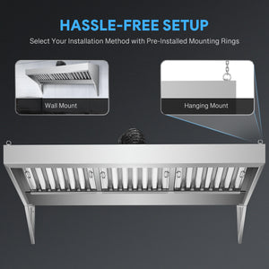 - Effortless Installation: Our commercial range hood is equipped with two sturdy mounting brackets for secure wall installation, and the pre-installed mounting rings make hanging it over your stoves a breeze.